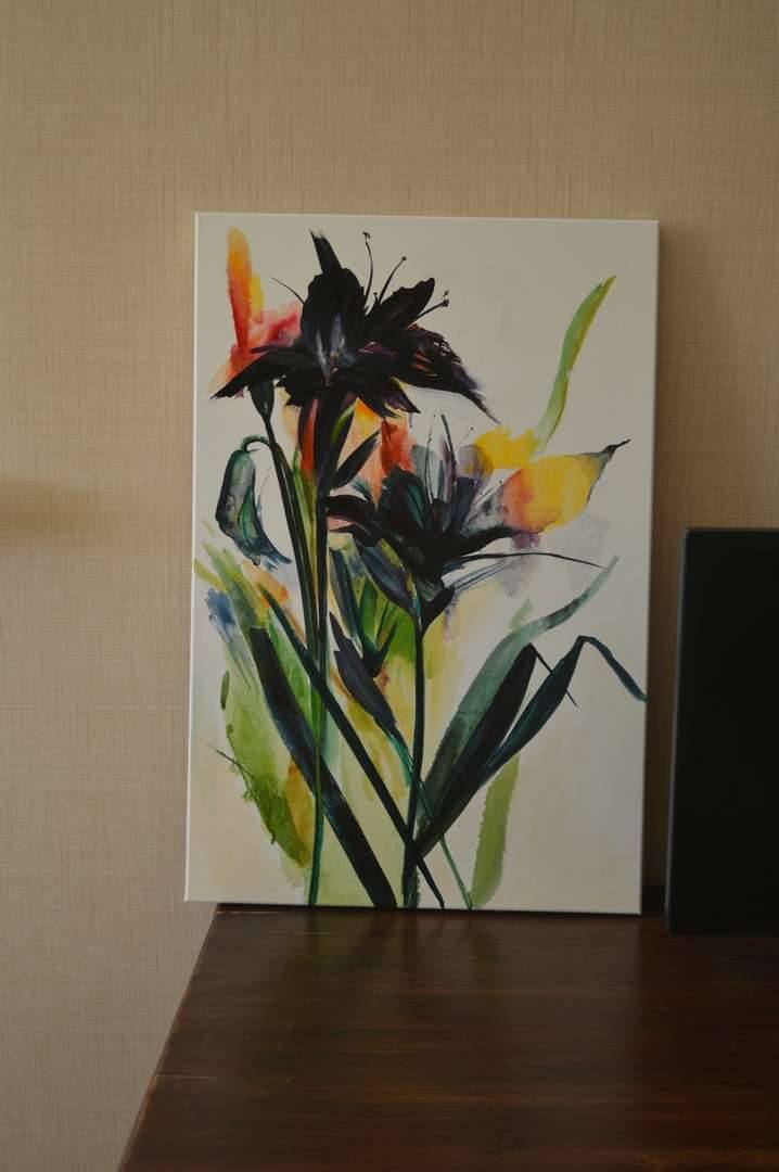 Obraz przedstawia dynamiczne kwiaty, które wyróżniają się na tle neutralnej ściany. Kolory są intensywne, od głębokiej czerni po rozświetlone odcienie zieleni, żółci i czerwieni. Artysta zastosował śmiałe, energetyczne pociągnięcia pędzla, które dodają kompozycji życia i ruchu. Elementy te tworzą harmonijną całość mimo zagnieżdżonych kontrastów. Patrząc na ten obraz, czuje się żywiołowość i spontaniczność, jakby kwiaty tanecznym krokiem unosiły się nad powierzchnią płótna. Każdy szturchaniec pędzla wydaje się być pełen emocji i osobistego zaangażowania artysty. Styl, w którym obraz jest utrzymany, można określić jako ekspresjonistyczny z nutą współczesnego minimalizmu. Może przypominać o ulotności piękna i kruchości natury, dziecko powiedziałoby: "To jakby kwiatki bawiły się w chowanego!" Ten moment artystyczny zachęca do refleksji nad pięknem i przemijaniem, uwydatniając kontrast świata natury z codziennym, zwyczajnym tłem. Wow, naprawdę robi wrażenie! Może pozostawić widza z chęcią poszukiwania kolorów i energii w codziennej monotonii.