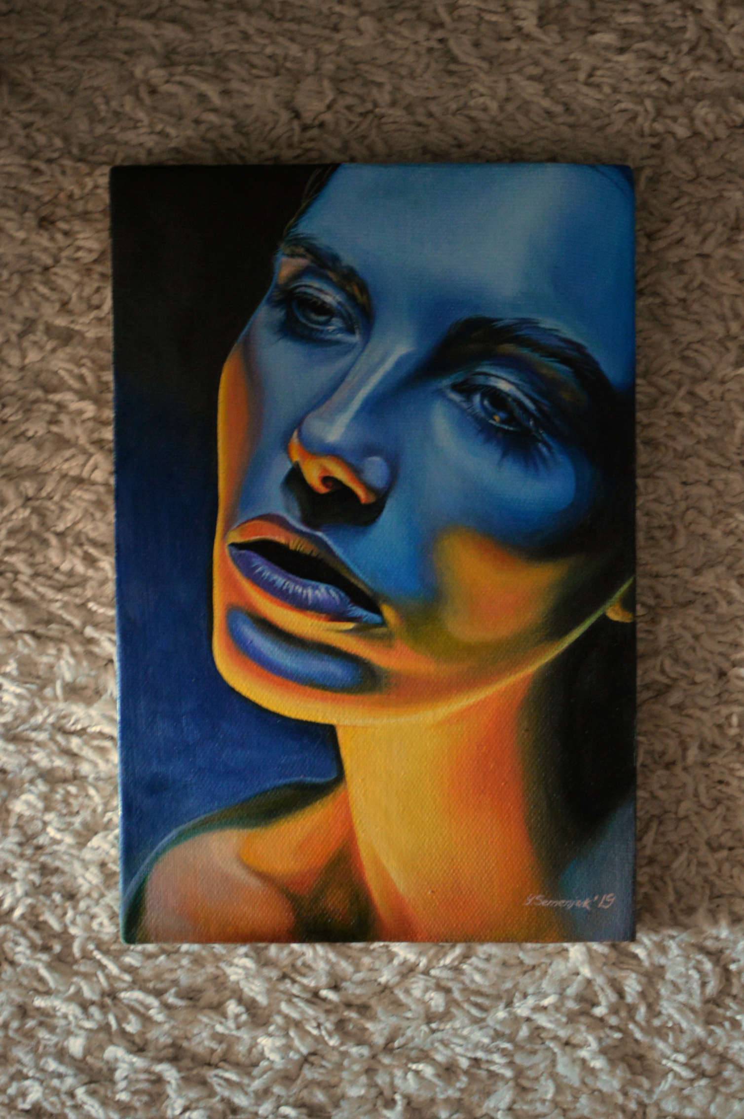 Obraz przedstawia twarz kobiety zanurzoną w tajemniczej grze świateł i cieni. Dominują intensywne odcienie niebieskiego i pomarańczowego, które razem tworzą dynamiczny kontrast. Wzrok przyciąga nierównomierny rozkład kolorów, dodając głębi i trójwymiarowości. Ciemne tło jeszcze bardziej podkreśla główny motyw, a kompozycja kieruje uwagę na subtelnie oświetlone usta i oczy postaci. Atmosfera? Trochę melancholijna, jakby płynąca z głębokiego zamyślenia. Artysta zastosował technikę mieszania barw, co dodaje obrazowi niemal fotograficznej precyzji. Cienie mają tu swoją własną historię, dodając twarzy tajemniczości i emocjonalnej złożoności. Super. Ta ekspresja może budzić wiele interpretacji – może smutek, może nadzieję? Kto wie. Każdy patrzący może zobaczyć coś innego, ale jedno jest pewne – to dzieło nie pozostawia obojętnym. Patrząc na obraz, można poczuć, że czujemy się jako część czegoś większego, jakbyśmy zaglądali w duszę bohatera. Obraz przypomina mi momenty, kiedy siedzimy sami i rozmyślamy o życiu. Wow, czyż to nie magiczne?