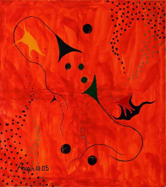 Obraz emanuje intensywnością czerwieni, która dominuje na płótnie, tworząc tło pełne energii i żaru. Na tym tle unoszą się czarne i zielone kształty, które przypominają abstrakcyjne formy organiczne. Są jak wirujące myśli, wprawiając dynamiczne wrażenie ruchu. Kompozycja łączy chaos z harmonią, jakby artysta chciał uchwycić esencję nieposkromionych emocji. Styl dzieła jest abstrakcyjny, z wyraźnym wpływem ekspresjonizmu. Technika malarska, choć wydawać by się mogła chaotyczna, jest zdecydowanie przemyślana, z precyzją w rozmieszczeniu kolorów i linii, która przyciąga wzrok do wewnętrznych detali. Obraz może budzić wiele emocji, od zachwytu po niepokój. Sprawia, że myślę o nieograniczonym wszechświecie emocji ukrytych w prostych formach. Wow, ale tu jest dużo czerwieni! Atmosfera dzieła, choć na pierwszy rzut oka energetyczna, ma w sobie coś medytacyjnego. Jak przy długiej wyprawie po górskiej ścieżce, gdzie każda linia i plamka prowadzi nas do celu. Te czarne kropki są really mysterious. Obraz jest jak pulsujący rytm życia, odbijający wewnętrzne konflikty i harmonie. Zachęca do refleksji, prowokuje, zmusza do zatrzymania się na chwilę i zastanowienia się nad strukturą własnych myśli i emocji.