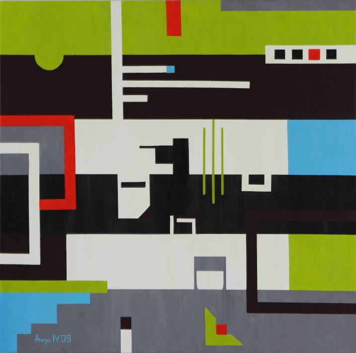 Na obrazie widzimy prawdziwą eksplozję kolorów i kształtów. Dominują tu zielenie i błękity, przetykane mocnymi akcentami czerni i czerwieni. Geometryczne formy nakładają się na siebie, tworząc złożoną mozaikę prostokątów i linii. Kompozycja jest dynamiczna, jakby w ciągłym ruchu. Atmosfera emanująca z dzieła jest pełna energii i nowoczesności, choć nie brakuje w niej pewnej tajemniczości. Styl artystyczny przypomina abstrakcjonizm geometryczny, może trochę jak układanka puzzli, która jeszcze nie znalazła swojego finału. Techniki, które zastosował artysta, są precyzyjne, a mimo to zostawiają miejsce dla interpretacji. Równowaga kolorów i kształtów przyciąga wzrok i prowokuje do dłuższego zastanowienia. Obraz może wywoływać u odbiorcy różne emocje: od entuzjazmu po zadumę, zachęcając do szukania porządku w chaosie. “To wygląda jak wielki, kolorowy labirynt” powiedziałoby dziecko patrząc. Ciekawy jest kontrast między uporządkowaniem a przypadkowością. Ten obraz to pure energy, tak wciągający, że aż trudno oderwać wzrok. Jest w nim coś hipnotyzującego, coś co sprawia, że człowiek czuje się trochę jak odkrywca w miejskiej dżungli kształtów. To jakby artysta bawił się formą, przekraczając granice tradycyjnego malarstwa. Każdy znajdzie tu coś dla siebie.