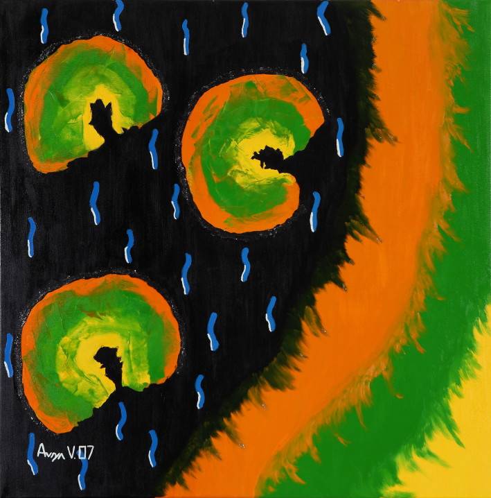 Obraz emanuje żywymi kolorami, tworząc dynamiczną i pobudzającą kompozycję. W centralnej części w oczy rzucają się trzy okrągłe formy, przypominające wiry energii, w odcieniach zieleni i pomarańczu. Na ciemnym tle rozrzucone są niebieskie linie, niczym krople deszczu tańczące w powietrzu. Krawędzie obrazu zdominowane są przez gradientowe przejścia zieleni w pomarańcz, co dodaje mu głębi. Całość tchnie świeżością i pewną niepokojącą tajemnicą - czy to oko cyklonu, czy nieznane zjawisko natury? Artysta zastosował technikę ekspresyjną, kładąc farbę grubymi pociągnięciami pędzla. Obraz jest niesamowicie energetyczny, niemal słychać w nim szum wiatru. Ten dynamiczny styl sprawia, że widz może poczuć dreszczyk emocji i dziwną radość. Wow! Patrząc na to dzieło, można poczuć wewnętrzny zgiełk związany z harmonijnym chaosem natury. Zastanawia mnie, czy artysta chciał przekazać coś konkretnego, czy po prostu bawić się kolorem? To painting prawdziwie hipnotyzuje! Osobiście, gdy na to patrzę, odczuwam jakby duszę tego miejsca, gdzie wszystko żyje w wiecznym tańcu. Coś w tym obrazie sprawia, że naprawdę chcę tam być i doświadczyć tego na własnej skórze.