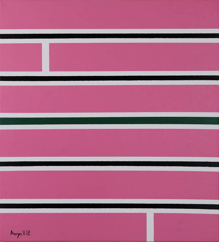 Obraz zachwyca prostotą i wyrazistością. Przeważa intensywny róż, który otula całe tło, przerywany poziomymi pasami czerni i bieli. Są to linie, które wprowadzają porządek i harmonię. Kompozycja zdaje się wręcz hipnotyzować, wciągając odbiorcę w symetryczny rytm. Atmosfera dzieła jest spokojna, ale jednocześnie intrygująca. Równowaga kolorów sprawia, że czujemy się jak w abstrakcyjnej krainie candy. Styl artystyczny przypomina minimalizm, z odrobiną pop artu. Artysta użył techniki, która precyzyjnie oddziela kolory, co dodaje dziełu elegancji. Patrząc na obraz, można poczuć pewną ulgę. To jakby zatrzymać się na moment w biegu codzienności. Nasze oczy odpoczywają, wędrując po równoległych pasach. Styl pisania musi odzwierciedlać tę swobodę, jakby ktoś szepnął, “easy on the eyes”. Jakie emocje mogą się narodzić? Dziecięca radość z rozpoznawania prostych kształtów, zaskoczenie, że minimalizm może być tak ekspresywny. I choć dzieło jest surowe, to jednocześnie kojące. Jakby wspomnienie z dzieciństwa, kiedy rysowaliśmy kreski na kartce, próbując uchwycić coś nieuchwytnego. Czy każdy z nas dostrzeże tu coś innego? Może to być śmiały gest artysty, który próbuje powiedzieć więcej, używając mniej. Jak ja lubię ten obraz, jak gumę do żucia o smaku maliny.