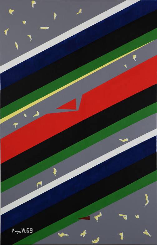 Na obrazie widzimy żywe, skośne pasy w dynamicznej kompozycji. Barwy przeplatają się nawzajem: intensywna czerwień, głęboki niebieski, zieleń, czysta czerń i subtelny odcień szarości. Pośród nich rozrzucone są małe, jasne plamki, które wyglądają jak drobne czynności przypominające wirujące liście na wietrze. Całość emanuje energią i ruchem, jakoś tak nieustannie przyciągając wzrok. Atmosfera obrazu wydaje się być gdzieś pomiędzy niepokojem a fascynacją, pobudza do refleksji i zastanowienia. Artysta posługuje się techniką geometrycznej abstrakcji, układając koloryw pasy o różnej szerokości. Kontrast i układ form tworzą wrażenie niemal muzycznego rytmu. Emocje, jakie wywołuje ten obraz, mogą być różnorodne; radość, dynamika działania, ale też może gdzieś tam kryje się chaos. A patrząc na wszystkie te elementy, zastanawiam się: co artysta chciał nam powiedzieć tak naprawdę? Hmm. Maybe it's just about finding order in chaos. Styl, w jakim został namalowany obraz, łączy w sobie precyzję i błyskotliwość. Sposób, w jaki barwy przechodzą jedna w drugą, przypomina mi beztroską zabawę dzieci. Hania powiedziała kiedyś, że to wygląda jak wielka tęcza, która się kłóci. Rozkłada się na naszej wyobraźni, zmuszając do refleksji nad porządkiem rzeczy. Pasjonujące i inspirujące, dające przestrzeń do własnych interpretacji każdemu, kto na nie spojrzy.