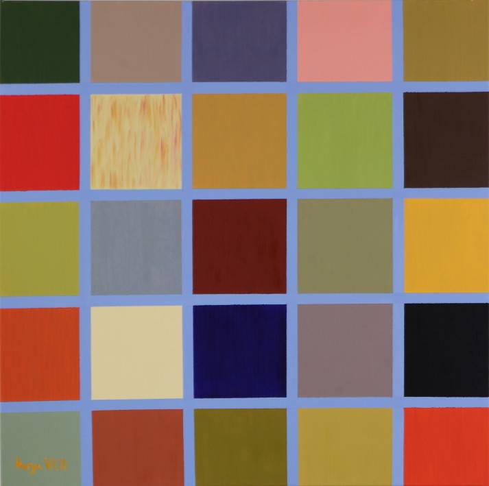 Na obrazie widzimy mozaikę złożoną z 25 różnobarwnych kwadratów, która od razu przyciąga wzrok swoją prostotą i dynamizmem. Kolory są intensywne: czerwienie, zielenie, błękity, a każdy z kwadratów jakby chciał opowiedzieć swoją historię. Przeważają ciepłe barwy, które tworzą atmosferę energii i radości, ale i subtelne odcienie beżu czy szarości dodają kompozycji trochę spokoju. Może to wyglądać jak artystyczny eksperyment z kolorem, ale co ja tam wiem. Obraz emanuje nowoczesnym stylem, trochę jakby prosto z galerii w Nowym Jorku, gdzie minimalizm spotyka się z silnym wyrazem. Artysta użył techniki płaskiej plamy barwnej, bez zbędnych gradientów, co nadaje całości surowości i precyzji. Patrząc na obraz, można poczuć całą gamę emocji. Może trochę nostalgii za dzieciństwem, gdy wszystko było prostsze. "Te kolorki są jak klocki" – powiedziałoby 7-letnie dziecko. Dla mnie to jak patrzenie na świat w pikselach, gdzie każdy kawałek ma swoje miejsce, choć na pierwszy rzut oka wydaje się chaotyczny. Ten obraz to perfect example sztuki, która zachęca do refleksji nad tym, jak postrzegamy kolory i emocje. Każdy kwadrat ma swój charakter, a razem tworzą harmonijną całość, która przyciąga i nie pozwala zignorować.