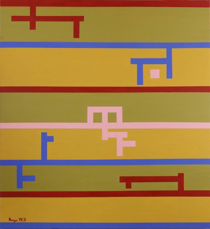 Na obrazie dominują intensywne kolory, w tym głębokie czerwienie, jasne błękity, delikatne róże i oliwkowe zielenie, które przeplatają się w geometrycznej kompozycji linii i kształtów. Kompozycja jest uporządkowana, linie biegną poziomo, sugerując pewną strukturalność, a zarazem otwierając przestrzeń do interpretacji. Atmosfera, którą ten obraz emanuje, jest jednocześnie dynamiczna i spokojna, jakby linie prowadziły nas przez opowieść, ale nie zdradzając całej historii. Styl jest nowoczesny, z wyraźnym wpływem abstrakcji. Technika użyta przez artystę to gra z kolorem i przestrzenią, typowa dla modern art. Obraz może budzić różnorakie emocje - od poczucia harmonii, przez chwilowe zagubienie, aż po refleksję nad uporządkowaniem chaosu. Może skłaniać do zastanowienia, jakie znaczenie kryją te kolorowe, przemykające linie. "To wygląda jak ogromny labirynt!" – powiedziałoby dziecko, dostrzegając w tym porządku coś znanego. Dla mnie to jakby muzyka zaklęta w kolorach, gdzie każda linia to nuta. Czerwień przypomina o pasji, błękit wprowadza spokój, róż dodaje lekkości. Ten obraz jest niczym wciągająca opowieść bez słów, zachęca do zatrzymania się na chwilę i zatopienia w niecodziennej estetyce.