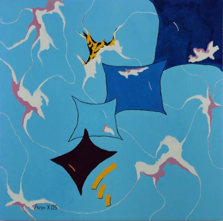 Obraz tętni życiem dzięki intensywnym kolorom, które zdają się tańczyć na jego powierzchni. Dominują tu różne odcienie niebieskiego, przeplatane ciepłymi barwami jak żółć czy delikatny róż. Centralnie umieszczone kształty przypominają unoszące się poduszki, które wibrują energią, a ich nieregularne kontury dodają dynamiki. Ta abstrakcyjna kompozycja pełna jest ruchu, a niemal organiczne linie przywodzą na myśl wodną toń lub powiew wiatru. Atmosfera dzieła jest bardzo uplifting, budzi na przemian spokój i fascynację. Styl artysty łączy delikatne, zwiewne pociągnięcia z odważnymi plamami koloru, co tworzy unikalną harmonię. Technika przypomina współczesny impressionism, jednak z domieszką stricte nowoczesnej abstrakcji. Obraz wciąga i wywołuje silne emocje, od radości po melancholię. Można się w nim doszukać metafory życia jako tańca kształtów i barw. "To wygląda jak latające chmurki!" – powiedziałoby dziecko, wpatrując się z zachwytem. W mojej opinii, to obraz, który mówi: take a breath. Każdy zakrętas i plamka stymulują wyobraźnię do tworzenia własnych interpretacji. Te pływające formy w pewien sposób przypominają beztroskę i szczęście dzieciństwa. Jakby daję się porwać bez końca temu kolorowemu spektaklowi.