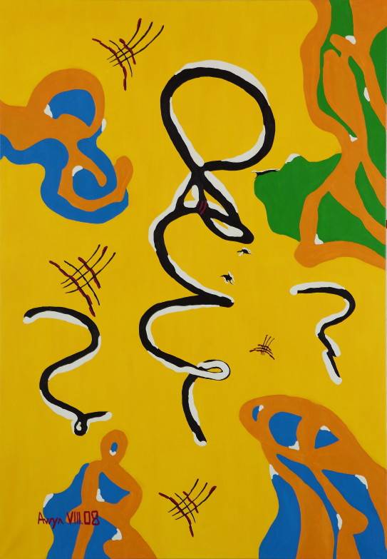 Obraz eksploduje żywymi kolorami. Żółte tło przypomina promienny, słoneczny dzień, a na nim tańczą krzywe kształty w odcieniach czerni, bieli, pomarańczu, niebieskiego i zieleni. Wygląda jak spontaniczny taniec linii i plam, tworzących chaotyczną, lecz intrygującą kompozycję. Atmosfera jest dynamiczna, niemalże pulsująca. Czujesz, jakby każdy element obrazu miał swoją energię i próbował z tobą rozmawiać w języku abstrakcyjnych form. Styl dzieła to abstrakcja totalna. Artysta użył grubych, odważnych linii i kontrastujących kolorów do stworzenia iluzji ruchu. Technika? To jakby farby same się prowadziły po płótnie, tworząc nieprzewidywalne ścieżki. Efekt jest jak melodyjna kakofonia - chaos i harmonia jednocześnie. Co widz czuje patrząc na ten obraz? Może to być radość z powodu tej eksplozji koloru. Może zaciekawienie, co artysta chciał przekazać. HEY, to wygląda jak wesoła kartka na urodziny! Jest miejsce na własne interpretacje, bogactwo emocji. Osobiście, ten obraz to dla mnie wyraz wolności. Czuję, że każdy z nas ma w sobie kawałek takiego chaosu, który domaga się uzewnętrznienia. Wow, takie colors! Jest jak szalona burza, ale w najlepszym znaczeniu tego słowa.