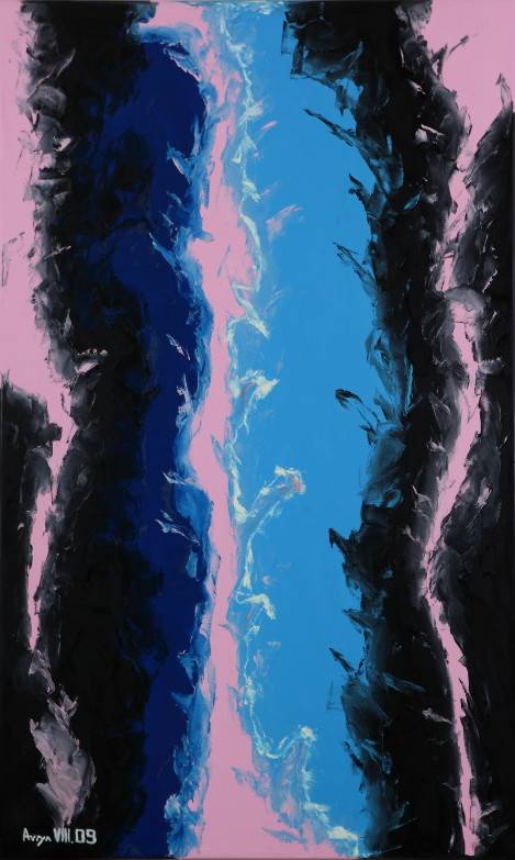 Obraz pełen kontrastów, gdzie intensywna błękitna pionowa smuga dominuje nad resztą kompozycji. Po obu jej stronach, jakby falujące fale, widać głębokie ciemnogranatowe i czarne zakrętasy. Od czasu do czasu odbijają się od nich różowe refleksy, tworząc dynamiczny ruch i jakby podkręcając "vibe" dzieła. Całość zbudowana jest z mocnych, wyrazistych pociągnięć pędzla, dając wrażenie energii i spontaniczności, które przyciągają spojrzenie. Ten obraz jest jak burza emocji, gdzie równowaga między spokojem a chaosem znajduje swoje miejsce. Artysta wykorzystał technikę impastu, tworząc trójwymiarową teksturę, co dodaje dramatyzmu i fizycznej obecności. Może to jak chwytanie momentu, kiedy niebo rozświetla się błyskawicą, a potem nagle jest cisza. Dla mnie, patrząc na ten obraz, czuję ekscytację i niepokój jednocześnie. To tak, jakby ktoś krzyczał "freedom!". Może to być także cudowna interpretacja walki między światłem a cieniem. A co by powiedziało dziecko? "To wygląda jak wielka kolorowa tęcza w nocy.". I to jest piękno sztuki – każdy widzi coś innego.