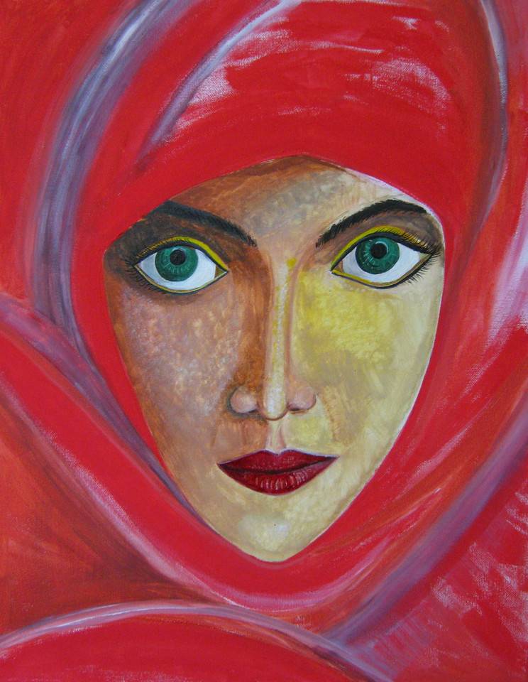 Obraz przedstawia tajemniczą twarz kobiety, której spojrzenie zahipnotyzować potrafi każdego widza. Centralnym elementem są ogromne, zielone oczy, które kontrastują z ciepłym, niemal ognistym czerwonym tłem. Czerwonawy odcień chusty oplata twarz, tworząc dynamiczną kompozycję pełną ruchu i energii. Techniką, którą posłużył się artysta, wydaje się być olej na płótnie, full of expressive brushstrokes. Atmosfera obrazu jest intensywna i enigmatyczna, przypomina spotkanie z dawnym przyjacielem, którego nie widziało się od lat. Pierwsze, co przychodzi mi na myśl to zaduma. Ale też swoista pewność siebie tej postaci. Czerwień tutaj jest symbolem pasji lub odwagi, choć ktoś inny zobaczy w niej miłość. Styl dzieła łączy w sobie realizm z elementami ekspresjonizmu. Widać to w mocnych liniach podkreślających kontury i intensywności kolorów. Obraz może wywołać rozmaite emocje. Od zachwytu po pewnego rodzaju niepokój. Dziecko powiedziałoby: "Ona ma oczy jak kosmitka!" Wpatrywanie się w te oczy może przywodzić na myśl refleksję o tym, jak często ukrywamy emocje pod pozorem spokoju. A może ta twarz mówi coś o naszej wewnętrznej sile. Who knows? Każdy z nas widzi coś innego, to magia tego obrazu.
