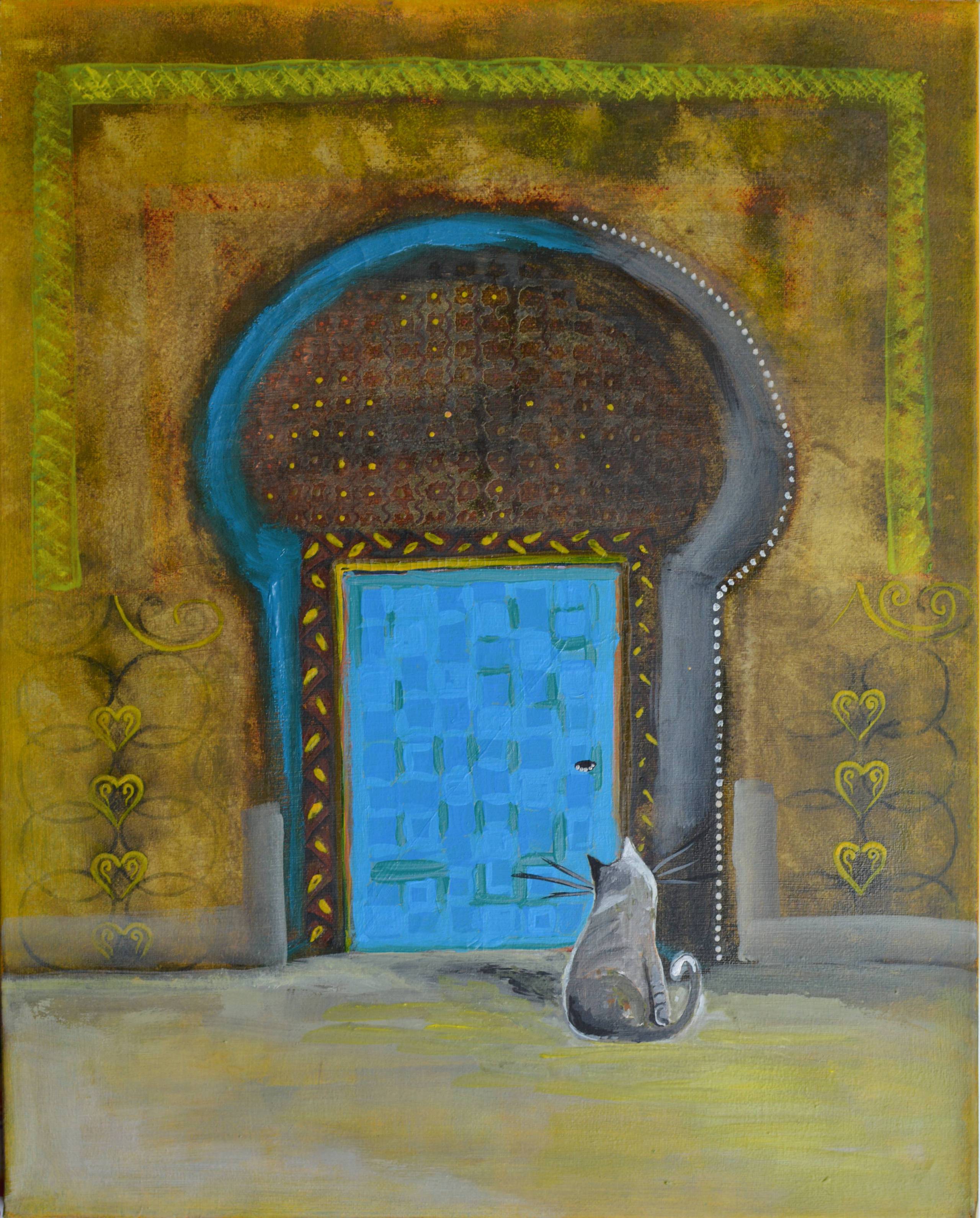 Na obrazie dominuje intensywna niebieska brama, która przyciąga wzrok niczym magnes. Otacza ją złocista ściana z delikatnymi, geometrycznymi zdobieniami, które dodają elegancji. Na pierwszym planie siedzi kot. Jego srebrzyste futro kontrastuje z tłem, a długie wąsy sprawiają, że wygląda, jakby czekał na jakieś magiczne wydarzenie. Atmosfera jest tajemnicza, niczym w baśni z tysiąca i jednej nocy. Artysta zastosował technikę mieszania akrylu z fakturą nadającą głębi i trójwymiarowości. Kocie spojrzenie kieruje naszą uwagę na bramę, która wydaje się być portalem do innego świata. Dzieło emanuje spokojem, ale jednocześnie zaciekawia. Kot siedzi jakby miał zaraz pójść do "wonderland". Patrząc na ten obraz, można poczuć nostalgiczną tęsknotę za przygodą lub tajemnicą, która dopiero ma się ujawnić. Czy ta scena to tylko wizja artysty, czy coś więcej? Wywołuje w nas dziecięcą ciekawość i pytania o to, co skrywa niebieska brama. Hej mamo, ten kot chyba chce pogadać z tą niebieską bramą! Wiesz, to takie "wow" uczucie, jak stoisz przed zagadką. Ten obraz jest po prostu jednym wielkim "mystery".