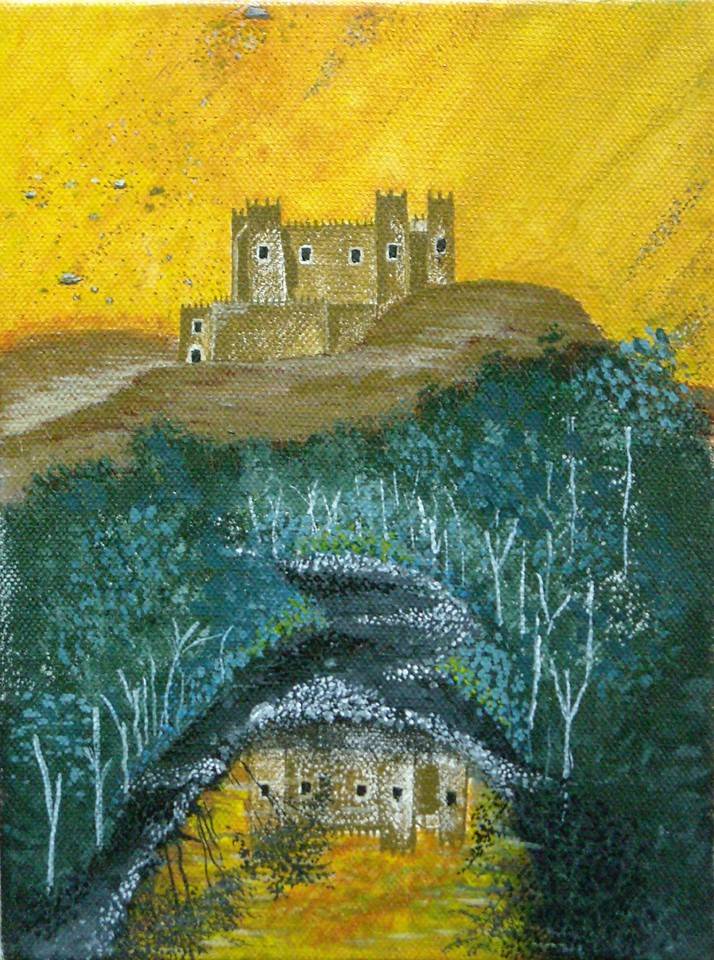 Na obrazie widzimy majestatyczny zamek górujący nad malowniczym krajobrazem, z dominującym, intensywnym żółtym niebem w tle. Struktura zamku, z jego prostokątnymi wieżami i solidnymi murami, kontrastuje z miękkimi liniami zieleni w dolnej części obrazu. Po drodze widać domek, otoczony przez ciemne liście i białe drzewa, które dodają mu tajemniczości. Ta mieszanka kolorów, od ciepłych złotych tonów po chłodne zielenie, nadaje całości dynamiczny i żywy charakter. Obraz emanuje spokojem, ale i pewnym napięciem, jakby przygotowywał widza na nadchodzącą przygodę. Styl malowania przypomina ekspresjonizm, z naciskiem na emocje i kolory. Farby zdają się być nakładane z lekką ręką, co nadaje całości delikatności. Sposób, w jaki artysta przedstawia światło, nadaje obrazowi "magical" feeling, jakby wszystko działo się w niezwykłej krainie. Takie dzieło może wywołać u odbiorcy różne emocje, od spokoju po fascynację tym, co może się kryć za wzgórzami. "Zamek wygląda jak z bajki!" – powiedziałby pewnie 7-letni maluch, który będzie marzył, by tam zamieszkać. Patrząc na obraz, można poczuć chęć wędrówki i odkrywania, jakby każda ścieżka prowadziła do nowej tajemnicy. Ten zamek, choć tylko na płótnie, zaprasza do odkrycia jego sekretów. Z każdym spojrzeniem odkrywamy coś nowego, intrygującego, co przyciąga nas jak magnes. To jedno z tych dzieł, które zostawia cię z poczuciem, że jeszcze nie wszystko odkryłeś, jeszcze coś czeka na odkrycie. Fascynujące.