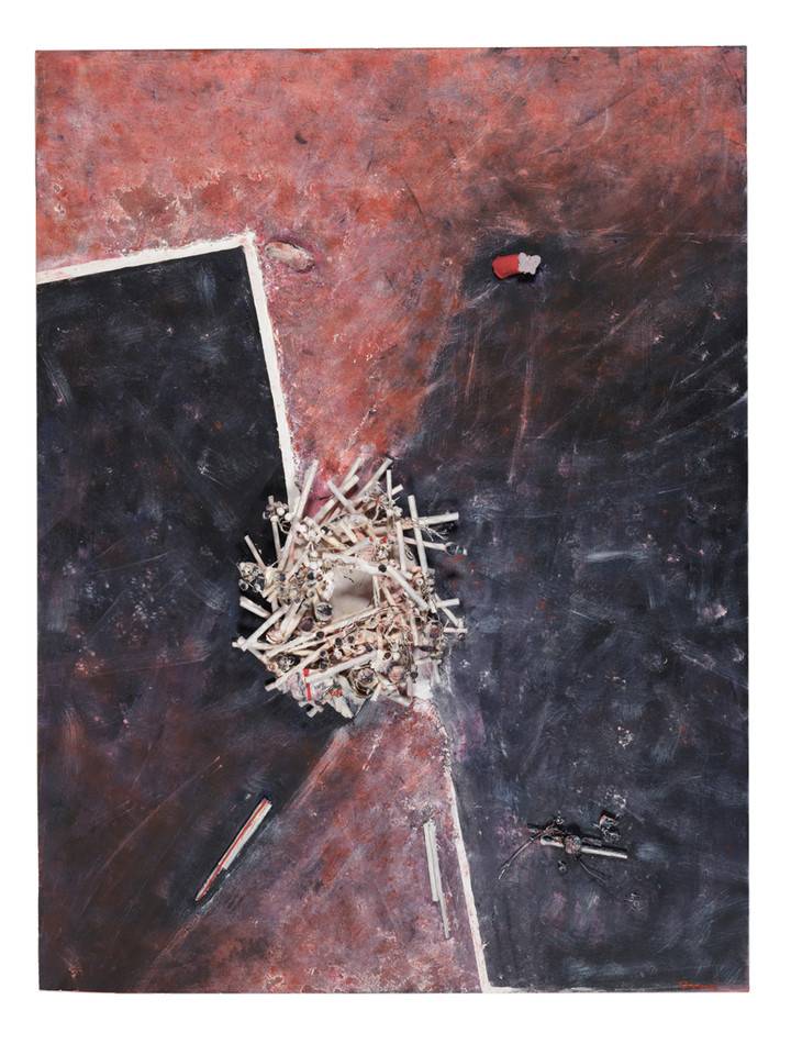 Kompozycja zawierająca elementy odstające od tafli obrazu . Całość na sklejce drewnianej o grubości krawędzi bocznych 5 cm .