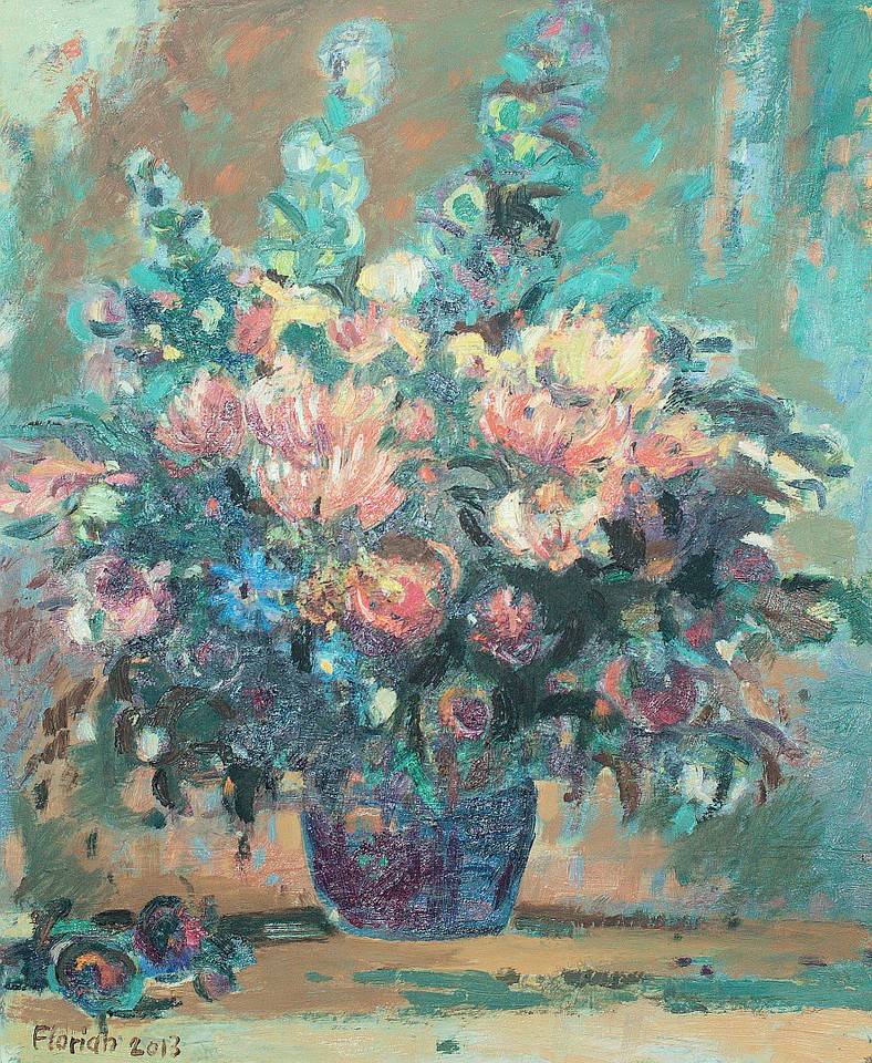 Na obrazie widzimy bogaty bukiet kwiatów w wazonie, który dominuje w centralnej części płótna. Kolory są żywe, ale jednocześnie subtelne, z przewagą ciepłych odcieni różu, zieleni i niebieskiego. Pociągnięcia pędzla są dynamiczne, co nadaje kompozycji pewną lekkość i ruch. Kształty kwiatów są miękkie i nieco rozmyte, co dodaje całości eterycznego charakteru. Atmosfera obrazu jest spokojna, wręcz nostalgiczna. Delikatne światło i gra cieni tworzą intymny nastrój, który niemal przenosi widza do innej rzeczywistości. Styl artystyczny można by określić jako impresjonistyczny, z wyraźnym naciskiem na oddanie wrażenia, a nie szczegółów. Obraz może budzić uczucia spokoju i kontemplacji. Praca z pewnością skłania do refleksji i zanurzenia się w świecie natury. Dziecko powiedziałoby: "Te kwiatki są jak chmurki, które przyfrunęły z nieba!" Technika malarska jest lekka, z widocznym ruchem pędzla i "touch" delikatności. Nieco niedbałe, ale celowe podejście artysty pozostawia przestrzeń dla wyobraźni odbiorcy. Tego rodzaju sztuka zmusza do zatrzymania się na chwilę w codziennym zgiełku i podziwiania piękna.