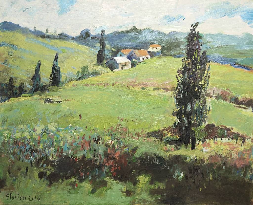 Na tym obrazie widzimy zieloną dolinę rozciągającą się po horyzont. Soczyste odcienie zieleni dominują w krajobrazie, przełamane gdzieniegdzie cienkimi, czarnymi cyprysami. W oddali widać małe domki o dachach w ciepłych odcieniach pomarańczu, dając poczucie spokoju i prostoty życia na wsi. Kompozycja jest harmonijna, prowadzi wzrok od pierwszego planu z kwitnącymi łąkami, aż po zamglone wzgórza w tle. Atmosfera tego dzieła jest niemal idylliczna, przywodząc na myśl letni dzień pełen słońca i ciepłego wiatru. Użycie techniki impasto nadaje teksturze obrazu głębi i dynamiki. To niemal jakby złapać moment, w którym świat zatrzymał się na chwilę. Obraz ten wywołuje uczucia relaksu i tęsknoty za prostym życiem z dala od zgiełku miasta. Styl malarski jest luźny, impresjonistyczny, co dodaje lekkości i ulotności ekstremalnej chwili. Kolory są delikatne, lecz wyraziste, wypełniają przestrzeń jak w dziecięcych marzeniach. "Look! There’s a tree!" mogłoby zawołać dziecko, widząc w centralnej części główne drzewo. Jest w tym coś magicznego, niczym powrót do dzieciństwa. Patrząc na ten obraz, czuję, że chciałbym tam być, w tej ciszy i spokoju, choć na chwilę.