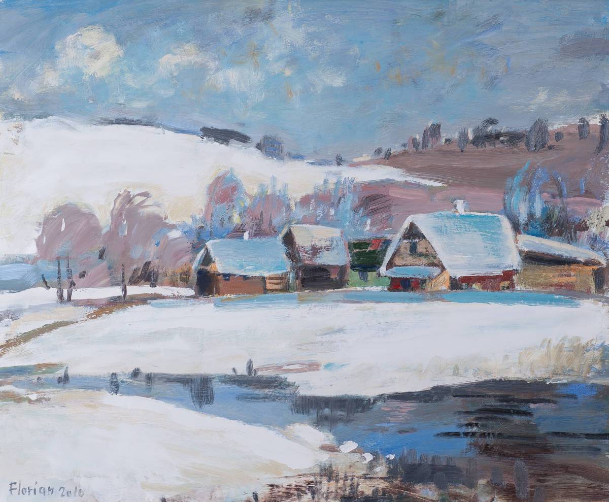 Na obrazie dominują zimowe krajobrazy, gdzie miękkie, delikatne biele śniegu kontrastują z błękitnym niebem przeplatanym obłokami. Drewniane chaty stoją wzdłuż spokojnej polany, ich dachy pokryte cienką warstwą śniegu. Artysta zastosował technikę impasto, nanosząc farby grubymi pociągnięciami, co dodaje tekstury i głębi. Kompozycja jest harmonijna, a horyzont delikatnie falujący, co nadaje scenie spokoju. To jest jak z baśni. Atmosfera obrazu jest ciepła, mimo zimnej palety barw. Czuje się nostalgię, tęsknotę za prostotą i spokojem wiejskiego życia. Może być kojący dla odbiorcy, przypominając o chwilach odpoczynku. "Look, mama, tam są domki!" powiedziałoby dziecko zachwycone widokiem. Styl pracy jest impresjonistyczny, pełen swobody i spontaniczności. Obraz może wywołać w nas zadumę, refleksję nad pięknem zatrzymanym w czasie. To prawdziwe winter wonderland, gdzie czas zdaje się zwalniać.