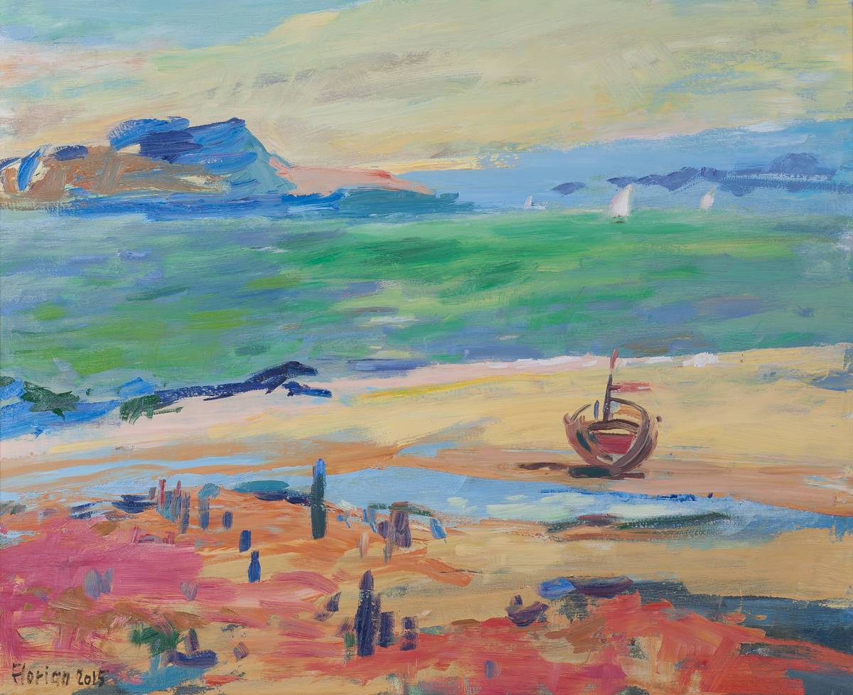 Na obrazie widzimy kolorowe pejzaż przedstawiający plażę z łodzią na brzegu. Dominują ciepłe odcienie pomarańczu i różu piasku, kontrastujące z chłodnymi błękitami i zieleniami morza. Niebo jest delikatnie rozświetlone pastelowymi kolorami, co nadaje scenie spokojny i senny charakter. Łódź na brzegu, samotna, jakby czekała na swój następny rejs. Artysta posługuje się techniką impasto, na której malowane pociągnięcia pędzla są wyraźnie widoczne, dodając tekstury i dynamizmu. To sprawia, że obraz wydaje się niemal dotykalny. Widać tu wpływy impresjonizmu, gdzie kolory i światło odgrywają kluczową rolę. Patrząc na ten obraz, można poczuć się zrelaksowanym, jakby się było na wakacjach. Morze szumi w oddali, a świeża bryza owiewa twarz. Ktoś mógłby powiedzieć: "Beach vibes", bo czemu nie? Praca ta przypomina mi lato, kiedy czas zwalnia. Wydaje się, że dzieło może budzić poczucie nostalgii za minionymi chwilami spędzonymi na plaży. Obraz jest prosty, a jednocześnie głęboki w wyrażaniu poczucia wolności i nieskrępowania. "Mama, chcę taką łódkę!" mogłoby powiedzieć dziecko, sądząc obraz. Koniec końców, robi się cieplej na sercu na ten widok.