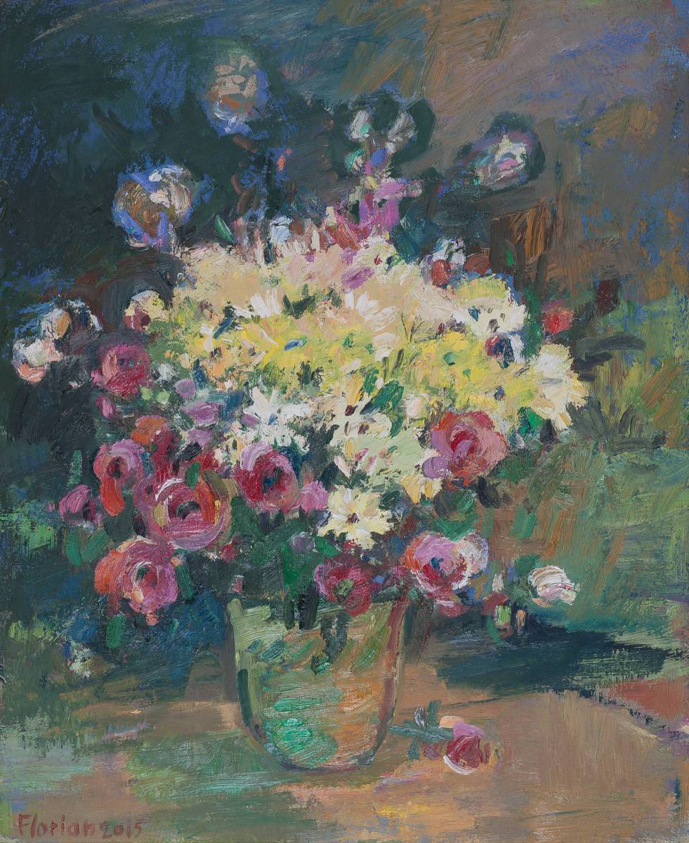 Na obrazie widzimy pełen życia bukiet kwiatów, które eksplodują paletą barw. Dominuje tutaj soczysta zieleń, różne odcienie różu i bieli, a zestawienie tych kolorów wprawia w zachwyt. Kwiaty zdają się być ledwo rzucone na płótno, co nadaje całości dynamiki. Tło obrazu jest ciemne, co sprawia, że kwiaty wydają się wręcz wyskakiwać na pierwszy plan. Atmosfera dzieła jest radosna i beztroska, aż chciałoby się powiedzieć "wow". Artysta zastosował impastową technikę, dającą bogatą fakturę. Pociągnięcia pędzla są szybkie, trochę jakby były robione w pośpiechu, ale efektywne. Styl można by określić jako impresjonistyczny, z nutą ekspresjonizmu. Obraz przywodzi na myśl letni poranek, kiedy słońce dopiero zaczyna podgrzewać ziemię. Kiedy patrze na ten obraz, odczuwam spokój i ciepło. To dzieło się bawi, nie narzuca swoich interpretacji, a każdy może w nim znaleźć coś innego. Może być odebrane jako ilustracja przemijającego piękna. Moje dziecko powiedziałoby: "Te kwiaty są jak u babci w ogródku!". Tak po prostu. Touch of nature sprawia, że jest ono wyjątkowe i pełne życia.
