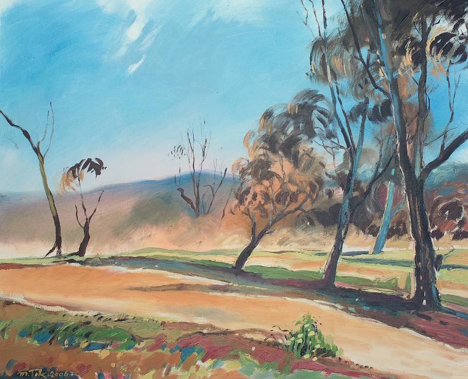 Na obrazie dominuje spokojna, pastelowa paleta kolorów. Łagodne tony błękitu nieba spotykają się z brązowo-zielonymi odcieniami ziemi. Drzewa, o pofalowanych kształtach, wydają się tańczyć na lekkim wietrze. Towarzyszy temu delikatna gra cieni, która dodaje dynamiki kompozycji. Patrząc na obraz, można poczuć się jak podczas letniego spaceru, gdzie czas płynie wolniej. Artysta użył swobodnych pociągnięć pędzla, co nadaje dziełu wrażenie lekkości i finezji. Jest w tym stylu coś impresjonistycznego, co choć nie do końca uchwytne, intryguje widza. "Niebieskie niebo jest piękne", powiedziałby pewnie mały obieżyświat. Obraz wzbudza nostalgię i spokój, przenosząc odbiorcę w miejsce, gdzie czas zdaje się nie mieć znaczenia. A może to tylko ja, ale jest w tej scenie coś deeply comforting. Myślę o ciepłych promieniach słońca i o drzewach szepczących tajemnice. Tego typu sztuka pozwala na chwilę ucieczki od zgiełku świata, skłaniając nas do refleksji i zatrzymania się na moment w biegu dnia codziennego.
