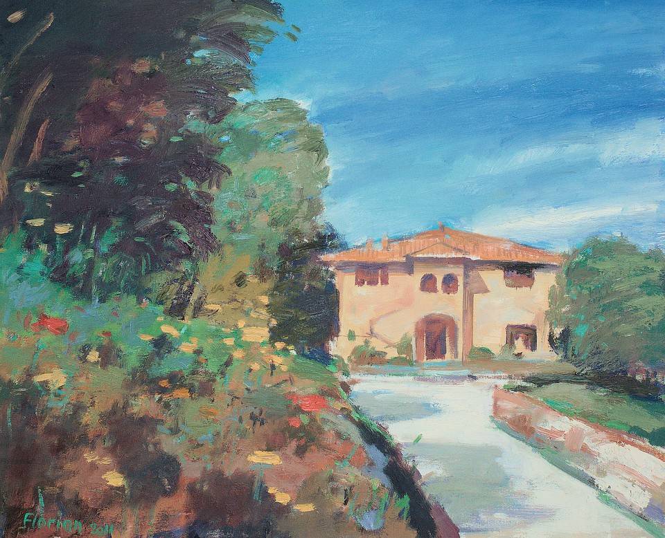 Obraz ukazuje sielankową scenę z jasnym budynkiem w centrum. Otacza go bujna roślinność, której zielone i brązowe odcienie kontrastują z błękitnym niebem. Świeże barwy, jakby złapane w kadr w porze letniego dnia, tworzą delikatną mozaikę, a dynamiczne pociągnięcia pędzla nadają całości ruch. Nastrój? No cóż, czysta idylla. Człowiek aż chciałby zanurzyć się w tej ciszy, usiąść na balkonie z kubkiem ulubionej herbaty i patrzeć na horyzont. Styl obrazu przypomina impresjonizm, gdzie artyści często uchwytują przemijające chwile, migotliwe światło i atmosferę. Obraz emanuje spokojem i może wprowadzać odbiorcę w stan refleksji nad ulotnością piękna natury. Patrzenie na niego wywołuje uczucie wakacyjnego relaksu i nostalgii. Jakby ktoś powiedział: "wow, to taki dreamy krajobraz!" „To wygląda jak domek z bajki!” powiedziałby może 7-latek. Najbardziej ujęły mnie detale roślinności – te plamy koloru jakby tańczyły na wietrze. Rozproszenie barw sprawia, że obraz zdaje się pulsować życiem. Bo tak, to miejsce, które przenieść może w świat marzeń.