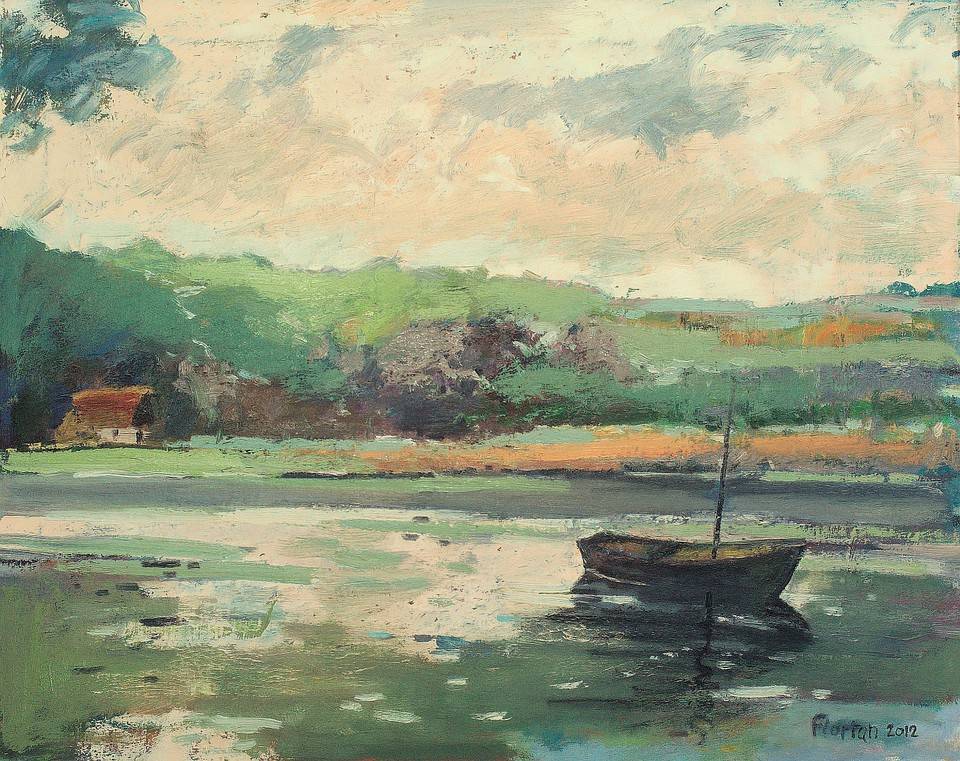 Obraz przedstawia nostalgiczną scenę nad jeziorem, gdzie spokojna woda odbija pastelowe niebo pełne miękkich chmur. Łódka, samotnie unosząca się na powierzchni, dodaje uroku temu idyllicznemu krajobrazowi. Kolory są delikatne: zielenie, błękity i odcienie ziemi, które płynnie przenikają się nawzajem, tworząc harmonijną kompozycję. Linie są miękkie, a kontury rozmyte, co nadaje obrazowi wrażenie spokoju i ciszy. Jak wtedy, gdy wszystko dookoła jest takie calm. Nastrój obrazu jest kontemplacyjny i melancholijny. Czujemy się jakbyśmy byli tam, słysząc śpiew ptaków i szum wody. Styl artystyczny przywodzi na myśl impresjonizm, z widocznymi pociągnięciami pędzla i skupieniem na grze światła. Artysta zastosował technikę impasto, co dodaje tekstury i głębi. Obraz wywołuje uczucie tęsknoty za prostszymi czasami i byciem blisko natury. Dla mnie to jak podróż do krainy spokoju. Dziecko mogłoby powiedzieć: "Łódka płynie, jakby tańczyła." Odbiorca może poczuć się, jakby sam unosił się na tej łódce, dryfując w dal. To dzieło porusza serce, przyciągając uwagę subtelnością, ale i siłą ukrytych emocji.
