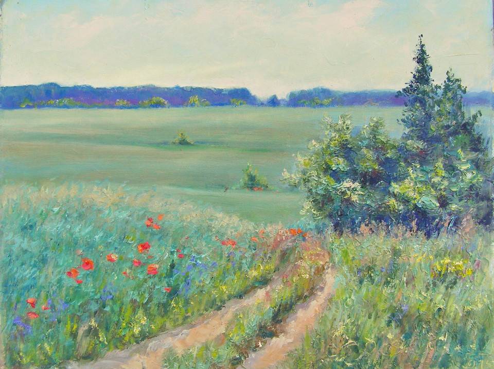 Obraz emanuje spokojem i sielankowym urokiem zielonego krajobrazu, które otula nas przyjemnym uczuciem. W centrum widzimy polną ścieżkę wijącą się przez mieniące się kolorami łąki, pełne czerwonych maków i błękitnych kwiatów, wybuchających intensywnymi barwami. Gdzieniegdzie połacie zielonej trawy przyciągają wzrok swoją świeżością. Drzewa po prawej stronie kompozycji dodają głębi i tajemniczości, jakby skrywały jakieś sekrety przyrody. Nastrój jest beztroski, almost magical, jakbyśmy byli w niekończącym się letnim dniu, gdzie czas płynie wolniej. Artysta sięgnął po techniki impresjonizmu, mieszając szybkie pociągnięcia pędzla, które oddają esencję chwili, zamiast jej dokładnych szczegółów. Barwy są delikatnie zamglone, jak przez poranne słońce i rzucają subtelne cienie. Łąka wygląda jak z bajki – powiedziałby to na pewno każdy 7-latek. Obraz wywołuje nostalgię za latami dzieciństwa i wakacyjnymi przygodami na wsi. Patrząc na to dzieło, czuję się jakbym znowu miał 7 lat i biegł przez te pola. Prowokuje do refleksji o prostocie i pięknie natury, których tak często dziś brakuje. Daje chwilę wytchnienia od pędzącego świata.