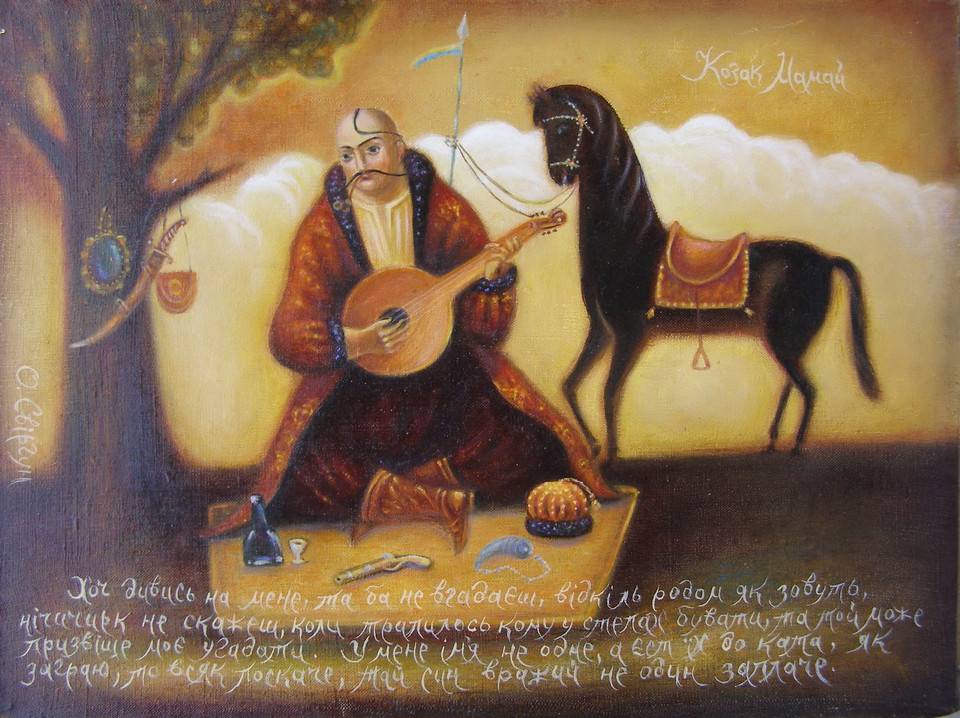 Na obrazie widzimy Kozaka Mamaja, postać wpisaną w ukraińską tradycję ludową. Mężczyzna siedzi pod drzewem, trzymając lutnię. Jego strój jest bogaty: czerwony kaftan i otulający płaszcz okrywają jego masywną postać. Kozak wydaje się zatopiony w grze, a jego spojrzenie zdradza spokój i melancholię. Obok stoi czarny koń, symbol siły i wolności, z siodłem zdobionym złotymi akcentami. Mimo że obraz może wydawać się prosty, kryje w sobie głęboki storytelling. Artysta zastosował ciepłe, ziemiste kolory, które emanują spokojem. Kompozycję wypełniają łagodne, zaokrąglone kształty. Technika przypomina tradycyjne malarstwo, z delikatnym cieniowaniem i precyzyjnym odwzorowaniem detali. Całość tworzy nostalgiczną atmosferę, jakbyśmy oglądali echo odległych czasów. Patrząc na ten obraz, czujesz ciepło zapadającego słońca, które kładzie złote promienie na ziemię. Mój młodszy brat powiedziałby: "Patrz, jaki fajny koń!". I coś w tym jest, bo obraz wzbudza tę prostą radość obcowania ze sztuką. Widać tu też duch "freedom", tak ważny dla kozackiej kultury. Dzieło może wzbudzać podziw dla dawnej wolności i oporu, skłaniając do refleksji nad tradycją i dziedzictwem. To jak mała podróż w czasie.