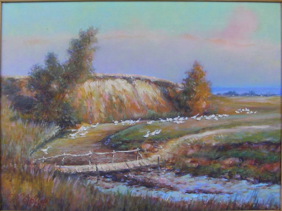 Obraz przedstawia malowniczy krajobraz o delikatnej kolorystyce, gdzie dominują pastelowe odcienie błękitu, zieleni i ciepłych brązów. Rzeka przecina łąkę, niespiesznie wijąc się między trawami. Na lewym planie widoczny jest mały mostek, a dalej stado białych ptaków leniwie spoczywa na trawie. Otoczenie wydaje się spokojne, wręcz idylliczne, jakby czas zatrzymał się w tym urokliwym zakątku natury. Styl obrazu jest pełen impresjonistycznej swobody, z miękkimi pociągnięciami pędzla i subtelnymi przejściami tonalnymi. Artysta wykorzystał technikę delikatnych, warstwowo nakładanych farb olejnych, co nadaje pejzażowi głębi i trójwymiarowości. Patrząc na to dzieło, można poczuć chłodny powiew wiatru i usłyszeć cichy szum rzeki. Jest tu coś magicznego, co przywodzi na myśl dzieciństwo i beztroskie chwile spędzone na łonie natury. Niemało emocji wzbudza ta sceneria. Dla jednych może to być reminder spokoju i harmonii z przyrodą. Dla innych retrospekcja dawnych letnich dni. Obraz przypomina, że świat wciąż pełen jest "magic moments", które czekają na odkrycie. Tu i ówdzie można zauważyć nieregularności, może celowe, które dodają dziełu autentyczności. Jak powiedziałby 7-latek: "Wow, jak tam jest pięknie, chciałbym tam pobiegać!". Przykuwa oko, prawda? To miejsce, gdzie chciałoby się znów znaleźć, choćby na chwilę. Rzeka i łąka stają się niemal symbolem wolności i niezmierzonego spokoju.