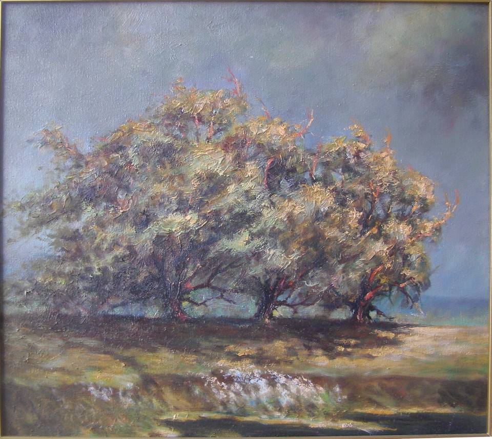 Na obrazie widzimy trzy majestatyczne drzewa, które stoją blisko siebie, tworząc naturalną barierę przeciwko wiatrowi. Kolory są stonowane, z dominującą paletą zieleni i brązów, która przechodzi w niebieskawe odcienie tła. Niebo jest zachmurzone, co dodaje odrobinę dramatyzmu całej scenie. Kompozycja jest harmonijna, drzewa są głównym punktem odniesienia, a perspektywa skupia naszą uwagę dokładnie na nich. Artysta zastosował technikę impasto, co sprawia, że powierzchnia obrazu jest niemal trójwymiarowa, przypominająca teksturą fakturę kory drzew. Atmosfera obrazu jest spokojna, lecz nie brakuje w niej napięcia. To jak przed burzą, gdy wszystko jest ciche, a natura wstrzymuje oddech. Styl malarski przypomina impresjonizm, z luźnymi pociągnięciami pędzla i dynamicznymi dabs of color. To piękne, jak artysta uchwycił ruch w tych nieruchomych obiektach. Wzbudza to poczucie nostalgii, może nawet tęsknoty za dzieciństwem. Mały widz mógłby powiedzieć: "Te drzewa wyglądają jakby się przytulały!". I coś w tym jest. Drzewa tworzą wspólnotę, ochronę przed nadchodzącą burzą. Ich korzenie być może są splecione głęboko pod ziemią. Obraz jest engaging, prowokuje do refleksji nad siłą i jednością natury. Chciałbym usiąść pod tymi drzewami, zapomnieć o całym świecie i poczuć się częścią tego "landscape".