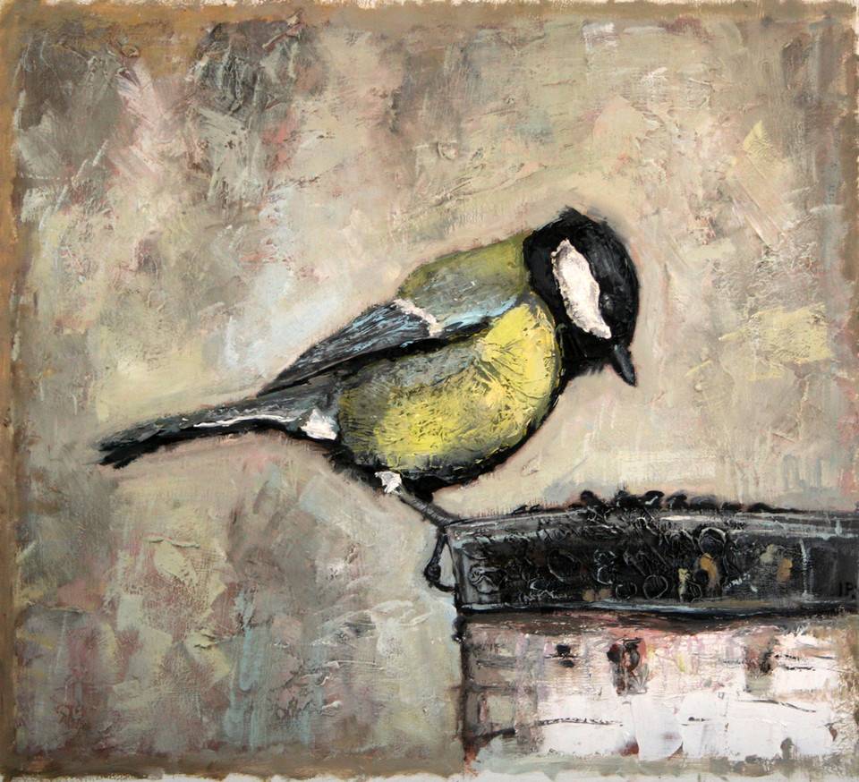 Na obrazie widzimy uroczego ptaka siedzącego na karmniku. Dominują ciepłe odcienie brązu, beżu i zieleni, które tworzą przytulną, niemal domową atmosferę. Kompozycja jest prosta - ptak odgrywa główną rolę, przyciągając uwagę swoją intensywną żółcią i ciemnymi skrzydłami. Tło jest rozmyte, co podkreśla dynamikę skrzydeł i delikatność piór. Atmosfera dzieła jest spokojna, wręcz medytacyjna. Można poczuć zapach lasu i usłyszeć świergot ptaków, choć to tylko obraz. Styl artystyczny przypomina impresjonizm, z grubymi pociągnięciami pędzla i teksturą farby. Wywołuje wrażenie ruchu, mimo że ptak jest nieruchomy. Technika impastu dodaje całości głębi i charakteru. Emocje, jakie emanują z tego obrazu, to spokój i radość. Można poczuć wewnętrzną harmonię, jakby świat na chwilę się zatrzymał. „Ptak jest głodny i szuka ziarenek!” - powiedziałoby 7-letnie dziecko, pełne zachwytu. To dzieło ma coś w sobie - texture! - co przyciąga uwagę i zaprasza do refleksji nad prostymi przyjemnościami życia. Może przypomnieć nam o drobnych chwilach radości i ważności codziennych obserwacji natury, które zdają się nie mieć końca. Obraz przemawia do mnie swoim ciepłem i wyważoną elegancją, będąc jednocześnie swego rodzaju medytacją spokoju.