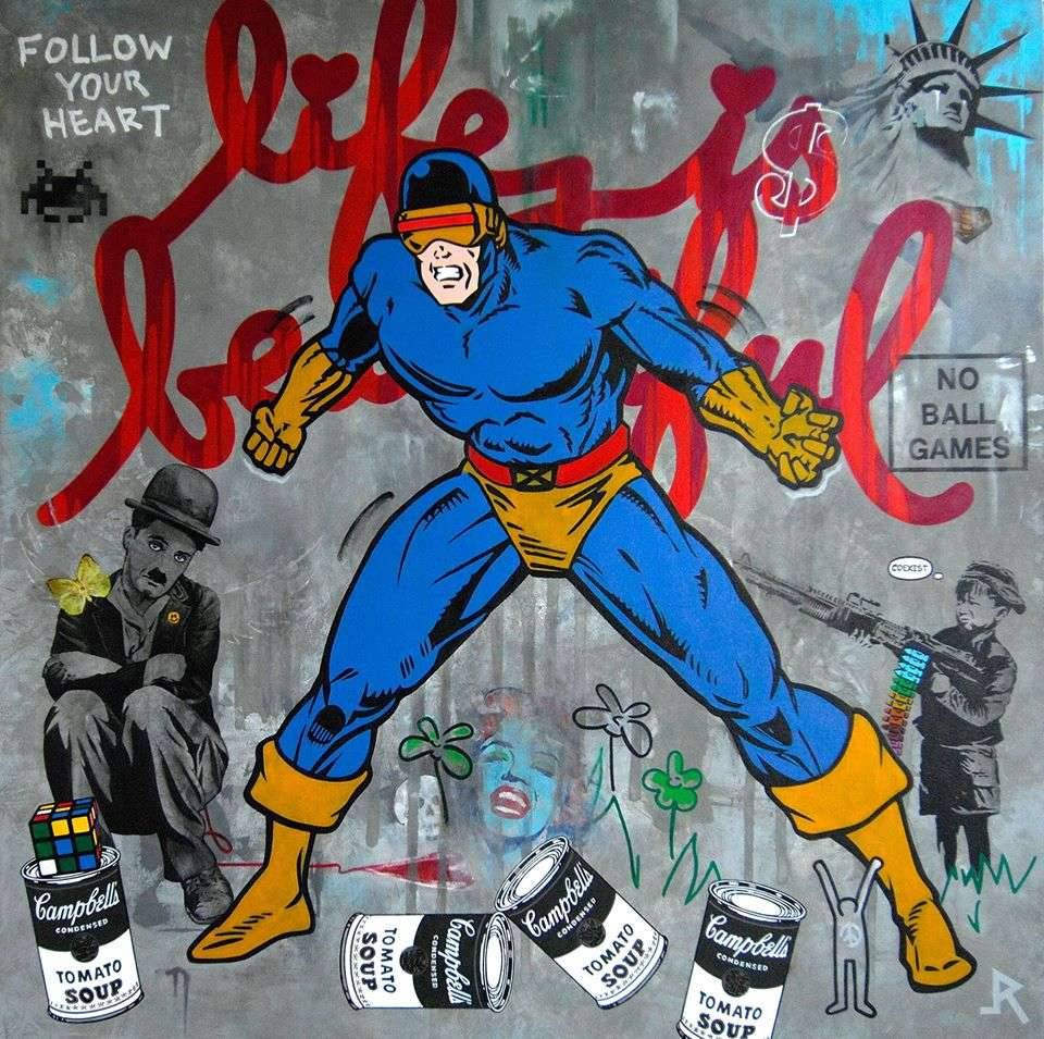 Obraz to eksplozja kolorów i popkulturowych nawiązań, które wciągają od pierwszego spojrzenia. Dominujący niebieski bohater w centrum kontrastuje z szarością tła, co dodaje mu energii i dynamizmu. Na prawo i lewo od niego pojawiają się ikony kultury: Marilyn Monroe, puszki zupy Campbell, a także postać podobna do Chaplina. Każdy z tych elementów przyciąga wzrok, tworząc miszmasz stylów i znaczeń. Life is beautiful – głosi napis, dodając optymistyczny ton temu wizualnemu zamieszaniu. Artysta zdaje się bawić stylem graffiti i kolażu, wykorzystując spraye i naklejki. Jest w tym coś z niedbałości, a zarazem z precyzji – to street art w najlepszym wydaniu. Można poczuć radość, ale i lekką ironię. To taki obraz, który mówi „hej, spójrz na świat uśmiechniętymi oczami”. Nastrój jest pozytywny, ale z przymrużeniem oka. Taki trochę prankster. Może wzbudzać zachwyt, ale i nutkę nostalgii za popkulturą minionych lat. Dla niektórych może być inspiracją do bycia „cool”. I właśnie, wow, jak tu dużo się dzieje! Wszystko tętni życiem i energią. A może to przesłanie, że sztuka jest naprawdę wszędzie, jeśli tylko chcemy ją dostrzec. Patrzeć na, smile!