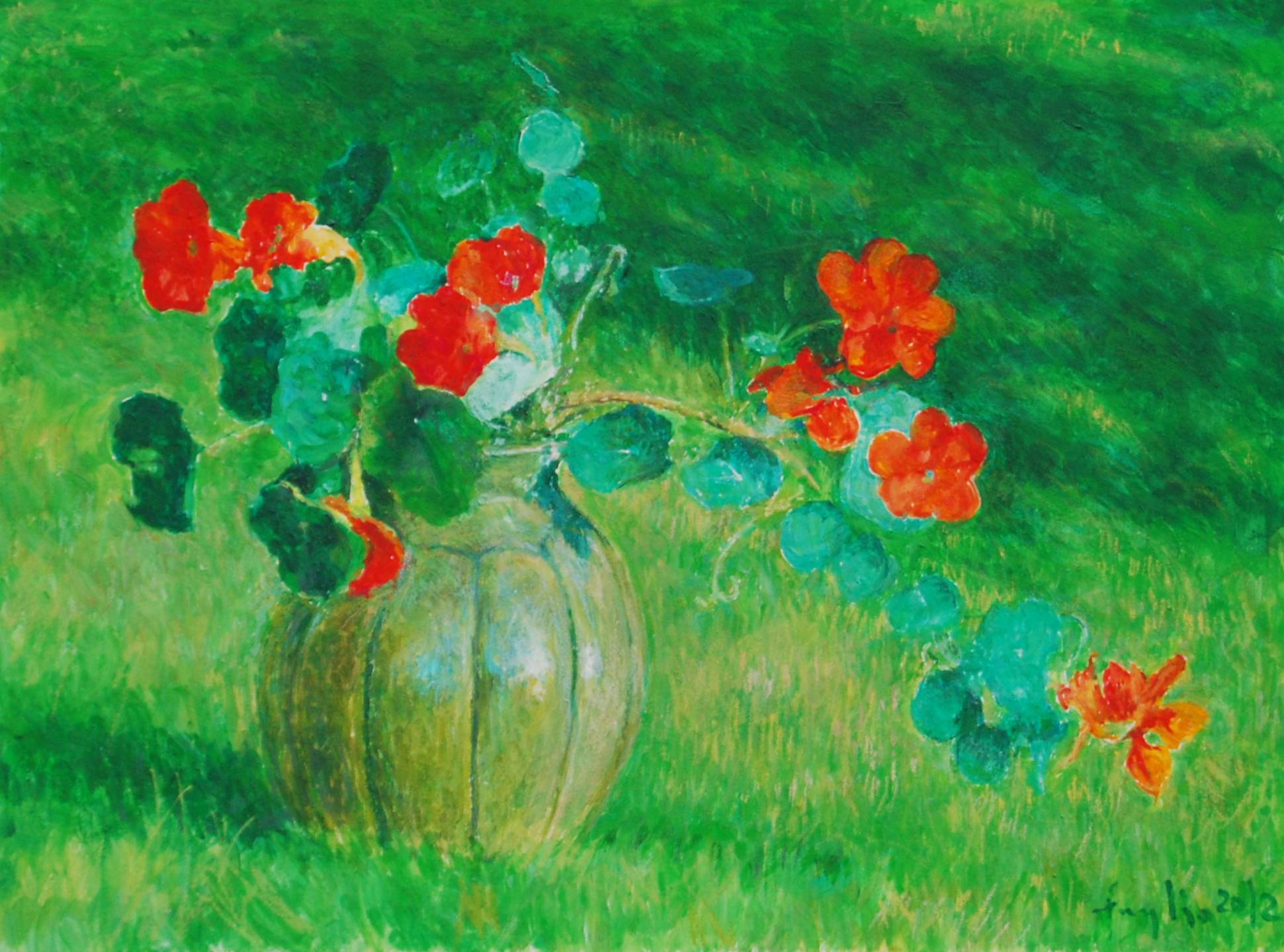 Na tym obrazie dominuje soczysta zieleń tła, kontrastująca z intensywną czerwienią kwiatów. Centralnym punktem jest ceramiczny wazon, z którego rozchodzi się kaskada kwitnących nasturcji. Pędzle artysty tchną w obraz życie, dając widzowi poczucie świeżości i natury. Kompozycja jest dość prosta, ale efektywna. Kwiaty, zanurzone w głębokim zielonym oceanie, wyglądają jak żagle na powierzchni morza. Artysta zastosował impresjonistyczny styl, z charakterystycznymi, miękkimi pociągnięciami pędzla, co dodaje dziełu lekkości i ulotności. Nastrój jest spokojny, trochę nostalgiczny. Przypomina letnie popołudnie, gdzie czas płynie powoli, a chwile beztroski mieszają się z subtelną melancholią. Takie obrazy sprawiają, że czujemy się "home", jakbyśmy wracali do miejsca, które dobrze znamy i kochamy. 7-letnie dziecko powiedziałoby: „To jak magiczny ogród babci!” Odbiorca może poczuć ciepłe promienie słońca, zapach kwiatów i usłyszeć szum wiatru. To miejsce, gdzie można się zatrzymać, odetchnąć i na moment zatracić.