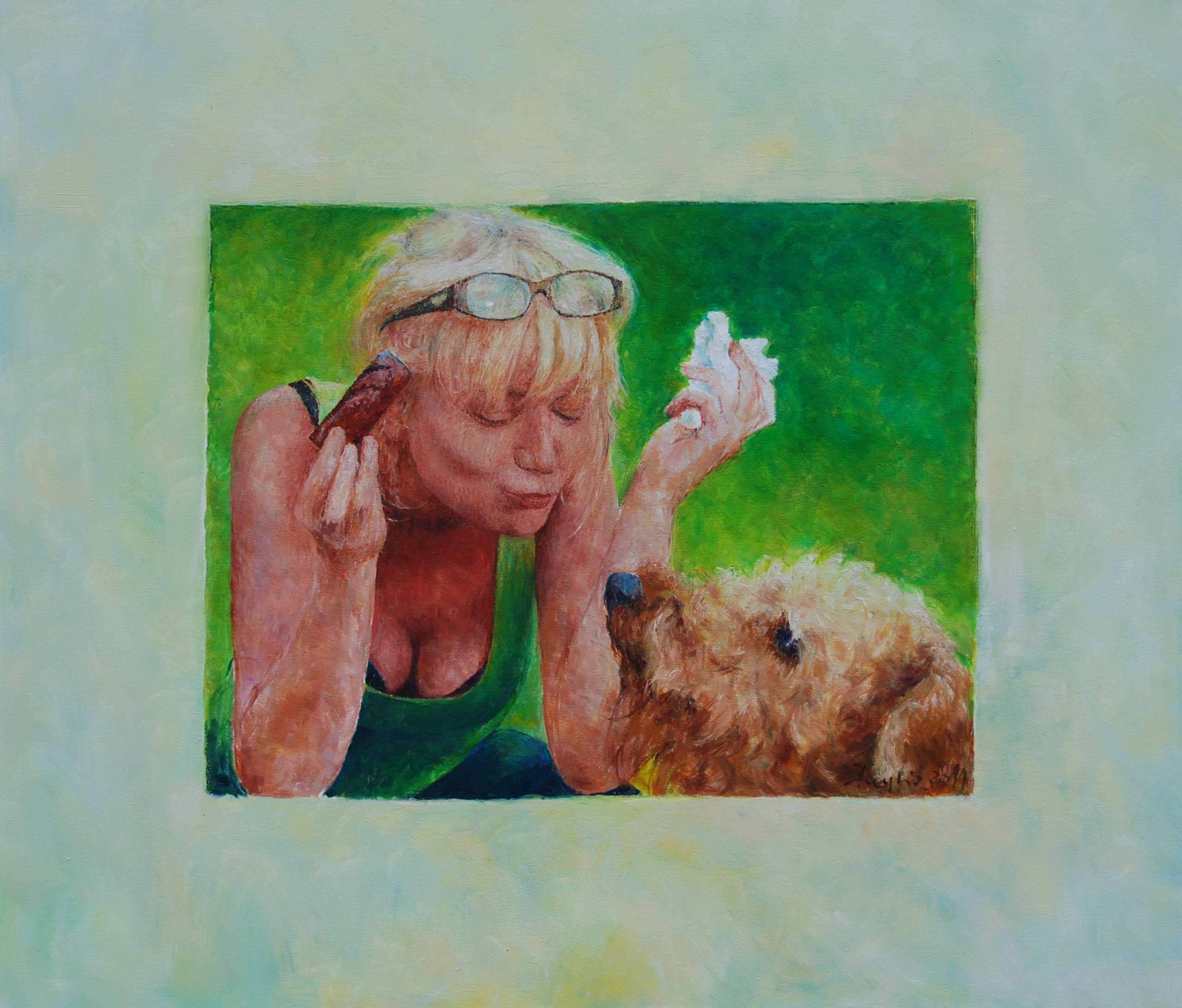 Na obrazie widzimy kobietę z jasnymi włosami, która trzyma w dłoni kawałek jedzenia i patrzy z czułością na psa. Tło jest intensywnie zielone, co dodaje świeżości i energii całej kompozycji. Kolory są żywe, a detale malowane są delikatnymi pociągnięciami pędzla, co nadaje obrazowi lekkości i dynamiczności. Atmosfera jest ciepła i pełna miłości, można poczuć, że między bohaterami jest silna więź. Technika jest realistyczna, ale jednocześnie artysta zastosował stylistykę impresjonistyczną, co sprawia, że obraz jest miękki i subtelny. Emocje, które może wywoływać ten obraz, to radość i poczucie beztroski. Przywodzi na myśl chwile spędzone z ukochanym zwierzakiem, kiedy świat na chwilę staje w miejscu. Myślę sobie, "takie momenty są najcenniejsze". Trochę jak w storybooku, gdzie każda strona niesie inne uczucie. Kolokwialnie mówiąc, to po prostu urocze, jak pies wpatruje się z uwagą, czekając na smakołyk. Całość jest playful, niemal słychać chichot w powietrzu. Mógłby to być kadr z wakacji, gdzie wszystko jest proste i szczere jak u 7-latka, który mówi: "pieski są najlepsze przyjacioły!". Obraz, choć prosty, głęboko zapada w pamięć, przypominając o drobnych przyjemnościach życia.
