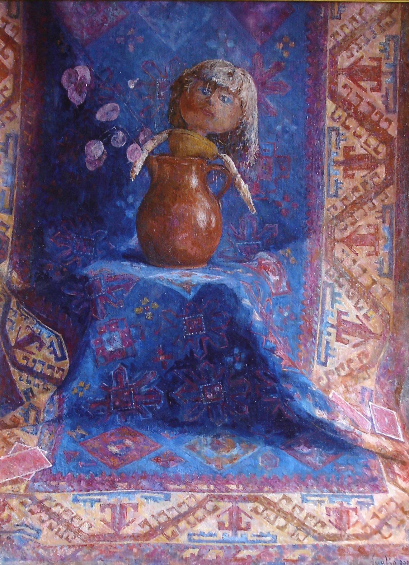Obraz ukazuje fascynująca kompozycję o intensywnych kolorach. W centrum znajduje się gliniany dzban, z którego wyłania się lalka o dużych niebieskich oczach, a jej twarz wydaje się zastanawiać nad czymś ważnym. Tło to bogato zdobiona tkanina, dominują tu odcienie niebieskiego i fioletu, z delikatnymi akcentami różu i pomarańczu. Motywy geometryczne na materiale tworzą iluzję ruchu, głębię i rytm. Atmosfera obrazu jest zarazem tajemnicza, jak i nieco nostalgiczna, przypomina przytulne wspomnienia z dzieciństwa. Styl artystyczny to mieszanka symbolizmu i realizmu, a technika olejna nadała dziełu subtelny blask. Odbiorca może czuć się zanurzony w świat pełen wspomnień i refleksji. Kolory i faktury sugerują podróż w czasie, do momentów, gdy wszystko wydawało się prostsze. Jakie to niesamowite, że jeden obraz może wzbudzić tyle emocji! Myślę o magicznej chwili, kiedy lalka staje się niemal prawdziwym towarzyszem. Jeden z angielskich słów, które przychodzi na myśl, to "mystery", bo obraz jest tak pełen sekretów. Błękitna głębia tła sprawia, że chce się zajrzeć głębiej, wyobrazić sobie, co czai się za rogiem tej krainy. Lalki przecież bywają magiczne, prawda?