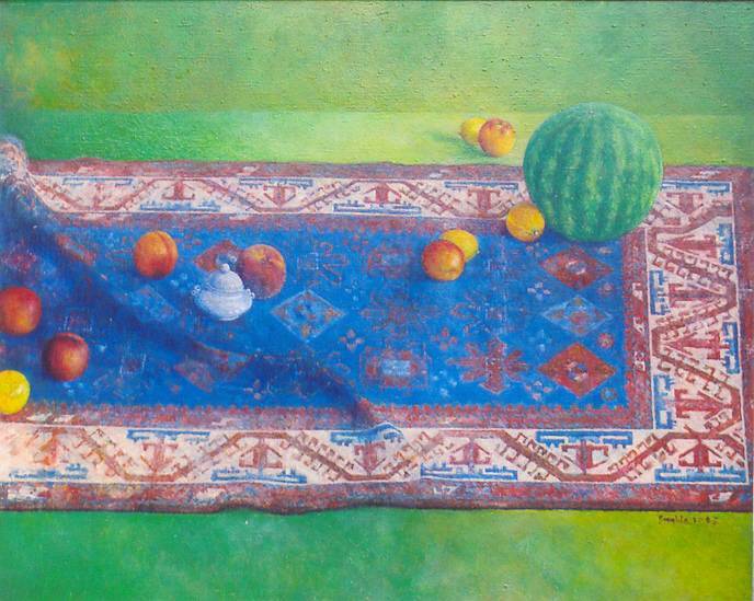 Ten obraz to prawdziwy feast for the eyes. W centrum znajduje się bogato zdobiony dywan w odcieniach głębokiego błękitu, czerwieni i bieli, który tworzy interesującą kompozycję w zestawieniu z zieloną trawą tła. Rzucone na nim owoce - jabłka, pomarańcze i arbuz - dodają żywych akcentów kolorystycznych. Nastrój jest spokojny, niemal sielankowy, jakby czas zatrzymał się tylko po to, byśmy mogli podziwiać ten moment. Artystyczne pociągnięcia pędzlem tworzą miękkie przejścia między kolorami. Na pierwszy rzut okaa, styl malarski jest realistyczny, ale z delikatnym poczuciem surrealizmu. Dywan wydaje się unosić nad rzeczywistością, a owoce, choć zwyczajne, stają się centralnym punktem dzieła. Dla mnie, to obraz pełen dziecięcej radości. Jakby ktoś chciał pokazać, że zwykłe owoce mogą być fascynujące. Fajnie by było położyć się na takim dywanie. A może to opowieść o letnim dniu, kiedy wszystko, co potrzeba, to chwila odpoczynku w cieniu słońca. Patrząc na to, czuję spokój i beztroskę.