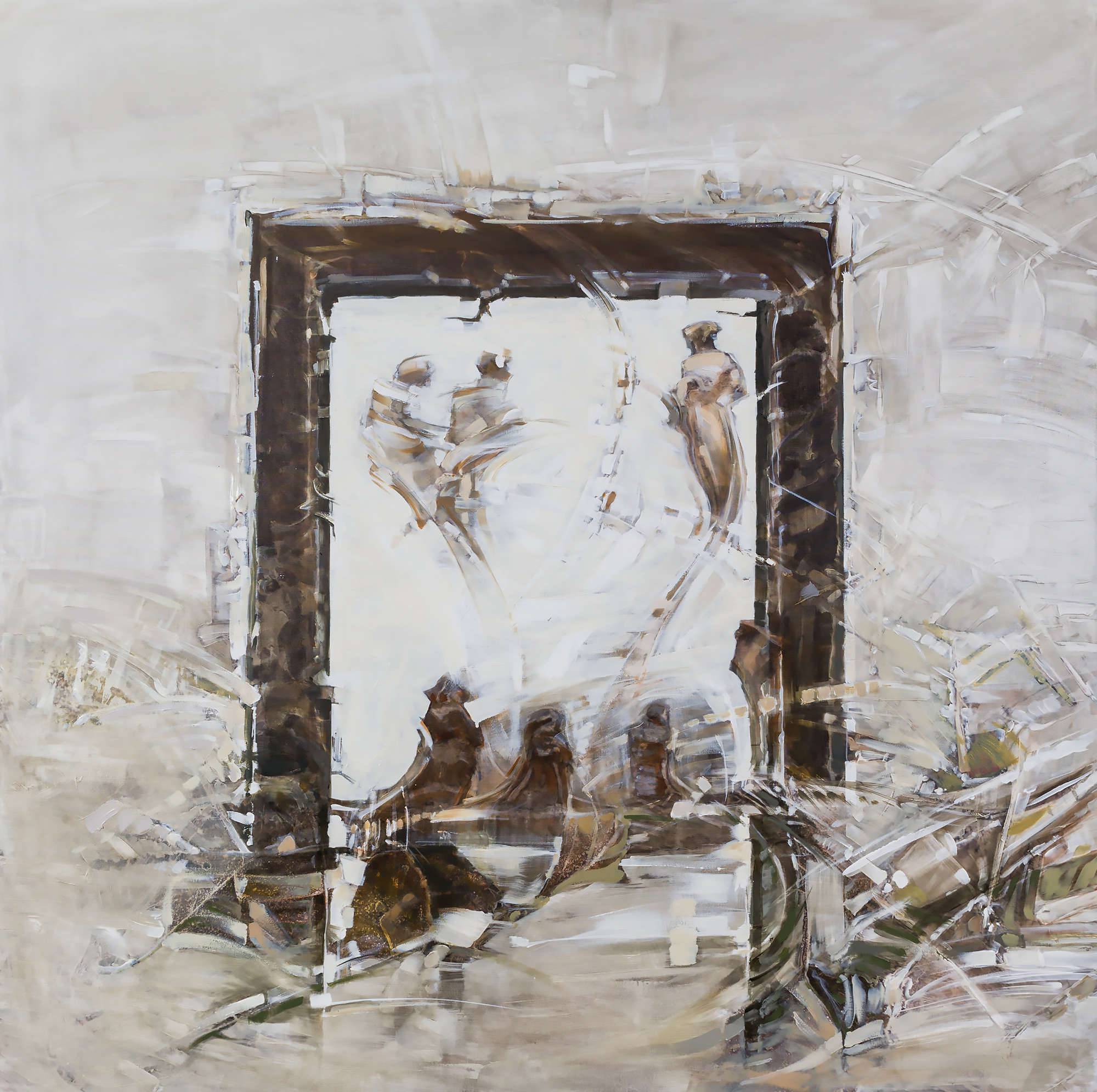 Ten obraz, zdominowany przez subtelną paletę bieli i brązów, emanuje tajemniczym urokiem. Centralnym punktem jest prostokątna ramka, wewnątrz której znajdują się dynamiczne, niemal taneczne postacie. Towarzyszy im aura eteryczności, jakby tańczące figury łamią prawa czasu i przestrzeni. Ruch pędzla jest energiczny, a artysta najwyraźniej lubił bawić się teksturą i światłem. Jasne tło nadaje dziełu lekkości, podczas gdy intensywność ciemniejszych odcieni wprowadza nutę dramatyzmu. Obraz sprawia wrażenie, jakby odcisnął na płótnie chwilowe wspomnienie, zatrzymany fragment snu. Choć formy są zamglone, dodają tajemnicy i z nutką curiosity zachęcają do odkrycia własnej interpretacji. To dzieło może budzić różnorodne emocje - od spokoju po refleksję nad kruchością życia. Technika przypomina impresjonistyczne wpływy, ale z wyraźnym impulsem współczesnej abstrakcji. Dla kogoś może to być scena z odległej przyszłości, dla innych echo z przeszłości. A ja zobaczyłem tam rycerzy. Każdy szczegół zachęca do przyjrzenia się bliżej, by odkryć potencjalne historie ukryte w zakamarkach pociągnięć pędzla. Ten obraz intryguje i pozostaje w pamięci na długo, jak opowieść, której zakończenie zależy od odbiorcy.