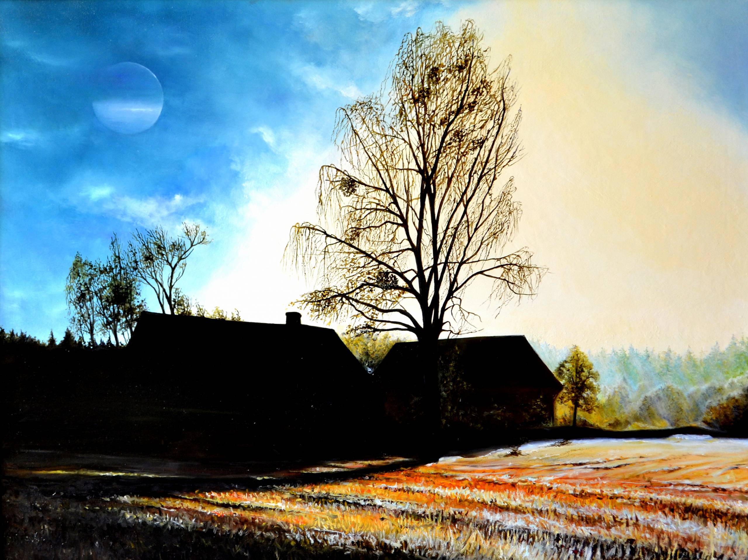 Na obrazie dominuje przepiękny kontrast między ciemnymi sylwetkami drzew a jasnym, niemal złotym niebem. Drzewa są delikatnie rozrysowane, ich gałęzie wydają się tańczyć na tle głębokiego błękitu. Kompozycja jest spokojna, a jednocześnie tchnie dynamiką. Uśmiecha się do nas wieczór, a może to brzask? Nie wiadomo, ale właśnie w tej niepewności tkwi magia. Ten krajobraz ma w sobie coś z magic garden, pełen tajemnic i ciepła. Artysta posłużył się techniką światłocienia, by oddać niepowtarzalny klimat chwili. Tego rodzaju dzieło może wzbudzić w człowieku melancholię, ale też i nadzieję. Myśli błądzą, zastanawiając się nad przemijaniem. To trochę jak patrzenie na bajkę wymalowaną farbami. Wow, jakie ładne kolorowe niebo! Obraz wywołuje osobiste refleksje na temat chwil ulotnych, które chwytamy, choćby na moment. Rozmaitość faktur i kolorów sprawia, że aż chce się dotknąć tej ciszy.