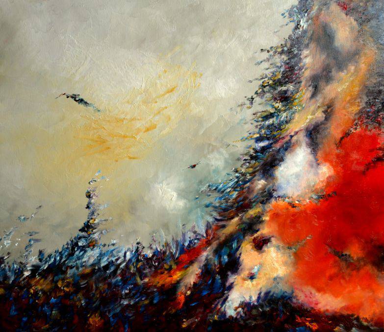 Na obrazie dominuje dynamiczna gra kolorów. Żywe czerwienie i pomarańcze płoną na prawo, pochłaniając spojrzenie, podczas gdy na górze spokojne żółcie przechodzą w stonowaną szarość. Wygląda to trochę jak burza emocji, prawda? Kształty są nieregularne, chaotyczne, przypominające migoczące płomienie i fale. Kompozycja sugeruje ruch, jakby wszystko wibrowało energią. Płótno emanuje dramatyczną atmosferą, która krzyczy: Attention! Artysta, używając technik impasto, zbudował teksturę pełną życia. Stosowane farby olejne sprawiają, że dzieło jest namacalne, wręcz trójwymiarowe. Nastrój jest pełen napięcia, ale zarazem intrygujący. To jak widok burzy na horyzoncie, która może z pewnością przynieść coś nowego. Odbiorca być może poczuje niepokój, ale też fascynację. Coś w stylu "Wow, co tu się dzieje?" To jest też moment, kiedy dziecko zawoła: Patrz, ogień na niebie! Całość wywołuje refleksję nad naturą chaosu i porządku. A ja czuję się porwany przez tę feerię. Ten obraz to prawdziwe "eye-catcher", nie pozwala od siebie oderwać wzroku. Czy to przypadkiem nie przypomina o sile i pięknie żywiołów?