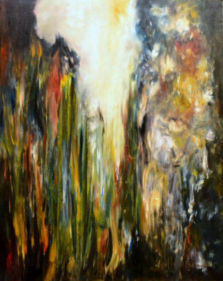 Na tym obrazie widzimy eksplozję kolorów. Feeria barw, od zieleni po żółć i ciepłe odcienie czerwieni, tworzy wrażenie ruchu. Kompozycja jest dynamiczna, z pionowymi smugami przypominającymi kaskady. Niebo w górnej części wydaje się rozmyte, jakby obłoki płynęły w bójnym tańcu. Technika artysty przypomina impast, z grubymi warstwami farby dodającymi tekstury. Atmosfera obrazu jest tajemnicza, może trochę nieziemskie. Przywołuje uczucie burzy w lesie albo baśniowego krajobrazu. Ten styl, ech, to jakby artysta eksperymentował z emocjami na płótnie. Obraz może wywołać różne emocje – dla niektórych to radość, a dla innych melancholia. Jest coś surrealistycznego, jakby skrawek dreamlandu wyciągnięty z podświadomości. Patrząc na to dzieło, czuję zarówno spokój, jak i niepokój. To tajemnica hidden in plain sight. Jak 7-latek, mogę powiedzieć: "To wygląda jak magiczny las pełen tajemnic." Ten obraz mógłby wisieć na ścianie w domu artysty, zawsze przypominając mu o sile wyobraźni. Co za wspaniałe połączenie kolorów!
