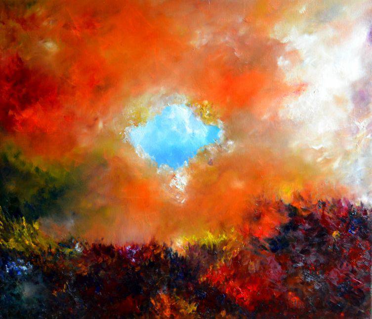 Ten obraz, niczym balet kolorów, emanuje energią i głębią emocji. Dominują tu ciepłe odcienie pomarańczy i czerwieni, które wirują wokół centralnej plamy błękitu, jak mały kawałek nieba, przynosząc uczucie spokoju w chaosie. Krawędzie kształtów są nieregularne, zdają się płynnie przechodzić z jednej barwy w drugą, nadając kompozycji dynamizmu. Atmosfera tego dzieła jest jednocześnie intensywna i hipnotyzująca. Jakby artysta chciał uchwycić moment przemiany, jak błysk między snem a jawą. Aż chce się tu przystanąć i pomyśleć, co właściwie widzimy. Czy to zachód słońca, czy może jakieś odległe pejzaże marzeń? Styl obrazu nawiązuje do abstrakcji, ale przywołuje również skojarzenia z impresjonizmem. Technika artystyczna widać, że pełna swobody, może delikatnego chaosu, pozostawia pole do interpretacji. Jest tu coś z "freedom", tej nienamacalnej wolności, którą każdy z nas czuje w różny sposób. Dla mnie, ten obraz to przypomnienie o pięknie, które istnieje gdzieś poza granicami codzienności. Jakby ktoś rozlał swoje marzenia na płótno. I wiesz co? Chciałbym, żeby kiedyś niebo było takie kolorowe!