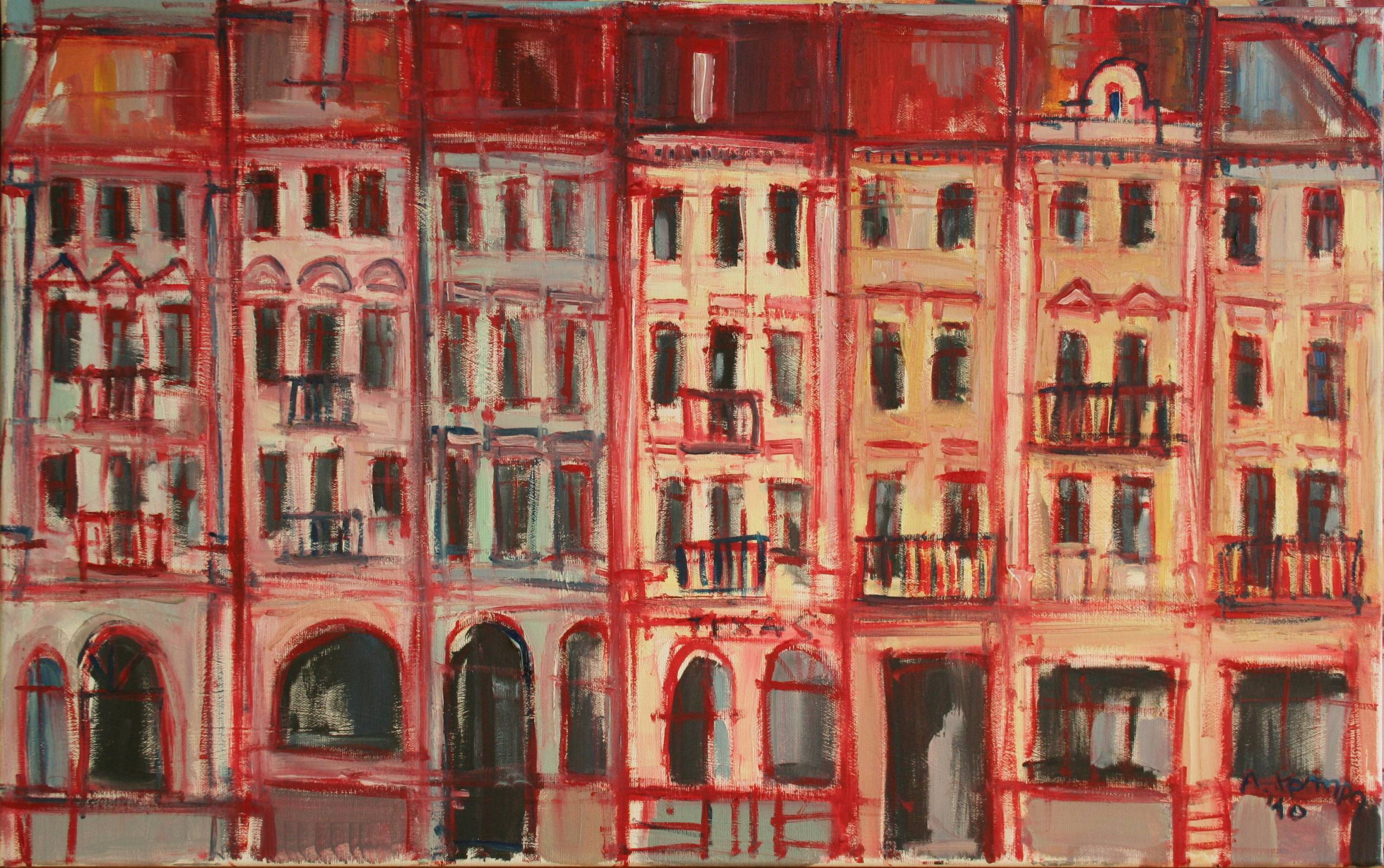 Na obrazie widzimy urocze kamienice, które na pierwszy rzut oka przyciągają uwagę ciepłymi odcieniami czerwieni i pomarańczy. Kolory są intensywne, jakby ktoś wylał na płótno emocje pełne ciepła i nostalgii. Linie budynków wydają się być lekko rozmazane, co nadaje im nieco surrealistyczny, dreamlike charakter. Kompozycja skupia się na fasadach, które układają się w rytmiczny szereg, jakby tańczyły ze sobą w harmonii. Atmosfera obrazu jest spokojna i subtelnie melancholijna. Czujemy, jakby czas się zatrzymał w tym uroczym zakątku ulicy. Styl artystyczny można zaklasyfikować jako ekspresjonistyczny. Artysta użył śmiałych pociągnięć pędzla, tworząc efekt bliski impresjonizmowi, ale z większym naciskiem na formę i kontur. Obraz może wywołać różne emocje. Dla jednych będzie to uczucie tęsknoty za minionymi czasami, dla innych uczucie ciepła i domowego spokoju. A może to jest miejsce, gdzie wszyscy znają nasze imiona? Wow, look at those colors! Jako dziecko byłoby to pewno zdanie w stylu: "Te domki wyglądają jak z bajki!". Nie można oprzeć się pokusie, by pomyśleć o dawnych spacerach po uroczych uliczkach, które kryją historie i sekrety. Obraz zachęca do chwili refleksji, do zatrzymania się i zanurzenia w jego magicznej aurze.