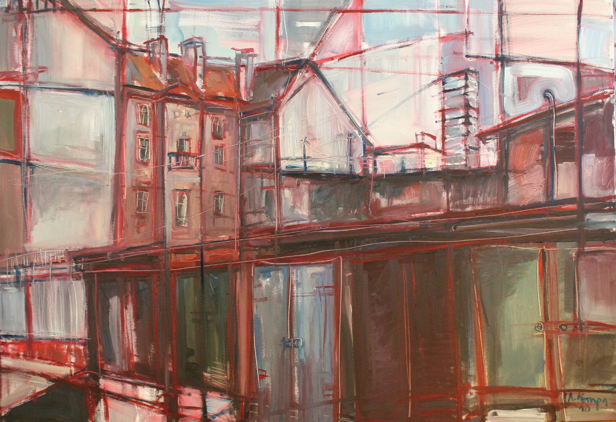 Obraz emanuje niezwykłą atmosferą miejskiego spleenu, gdzie zderzają się modernizm i nostalgia. Dominują tu ciepłe barwy - czerwienie, brązy i subtelne szarości, tworząc harmonijną, aczkolwiek tajemniczą kompozycję. Linie i kształty są dynamiczne, przeplatające się ze sobą niczym nitki w gobelinie. Artysta zastosował technikę olejną, co dodaje całości głębi i tekstury. Malarstwo to jest impresjonizmem z nutką abstrakcji. Odbiorca może poczuć się jak na spacerze po pustych uliczkach miasta po zmroku. Widz ma wrażenie, że miasto jest żywe, ale jednak puste. Patrząc, można poczuć nutkę melancholii. "Wow, jakie to duże budynki" - powiedziałby mały brzdąc. Obraz ten zmusza do refleksji o przemijającym czasie. Przebija się z niego nutka smutku, ale i ciepła przygoda do wspomnień. Kolory, które wibrują i przeskakują, dodają dynamiki i pomagają w odbiorze. Czasami aż chce się powiedzieć "Amazing!" na to, jak bardzo praca ta potrafi wciągnąć obserwatora.