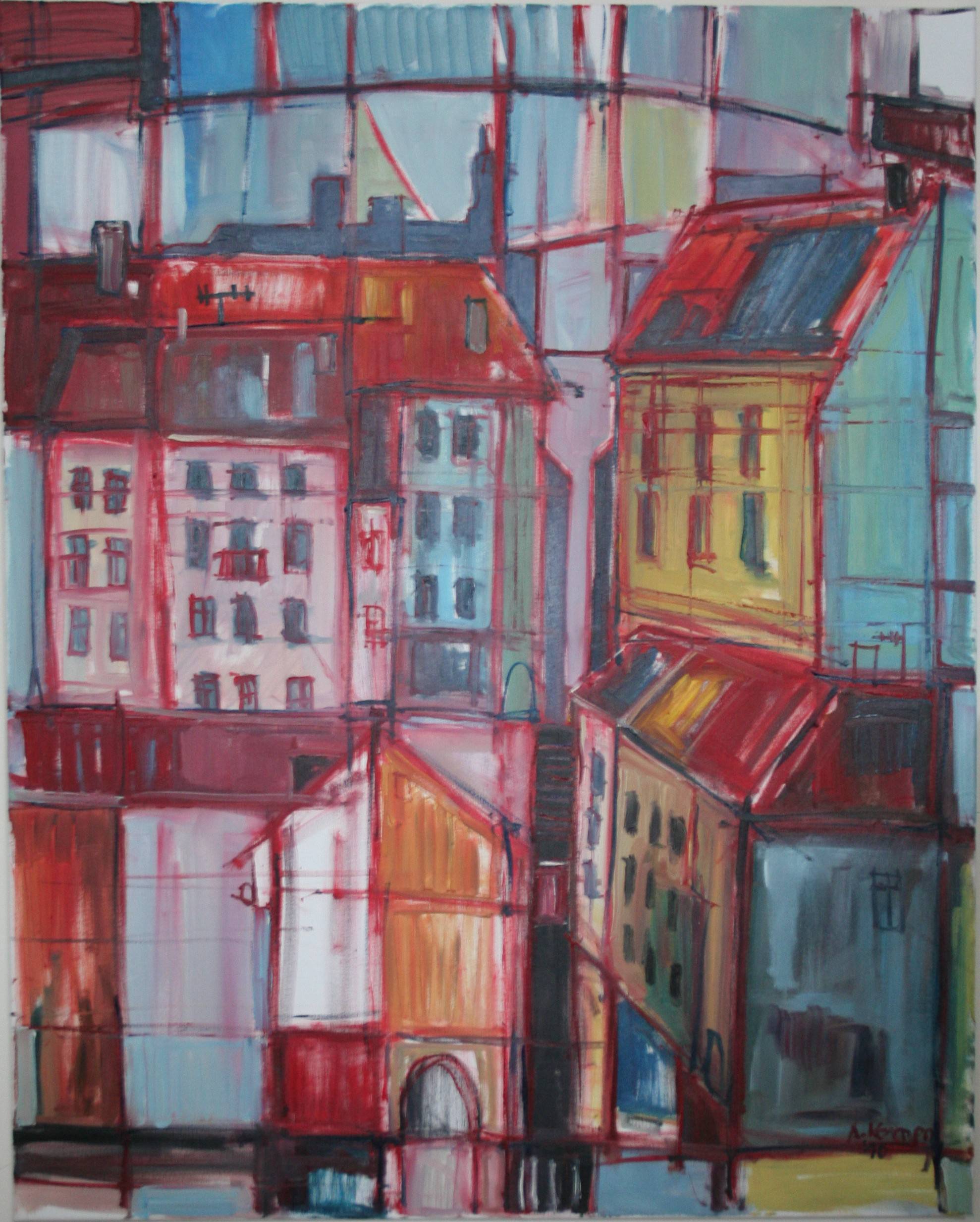 Na obrazie dominuje kalejdoskop ciepłych kolorów. Połączenie czerwieni, żółcieni i błękitów tworzy dynamiczną miejską scenerię. Kształty budynków są wyraziste i geometryczne, co nadaje kompozycji rytm i pewien niespokojny dynamizm. Wzrok przyciągają czerwone dachy, które kontrastują z bardziej stonowanymi, pastelowymi ścianami. Linia zabudowy wydaje się poszarpana, wręcz nieco chaotyczna, a jednocześnie niezwykle intrygująca. The atmosphere? Jest pełna nostalgii i swoistego uroku miejskiego życia. Niektóre budowle wydają się niemal ożyć, jakby artysta uchwycił moment z codzienności, który za chwilę przeminie. Dominujące barwy i gry światłem przypominają impresjonistyczny styl, choć technika wydaje się być bardziej niedbała, tak jakby artysta śpieszył się, by uchwycić chwilę. Jest to obraz, który może budzić w odbiorcy różnorodne emocje. Od poczucia zakorzenienia w miejskiej dżungli po marzenia o prostocie dzieciństwa. Patrząc na niego, można poczuć ciepło słońca na skórze i zapach ulicznych kafejek. Wraca nagle wspomnienie miłych spacerów i beztroskich dni. „To wygląda jak domki z klocków!” mogłoby powiedzieć dziecko, i w rzeczy samej, coś w tym jest. Kompozycja emanuje spontanicznością i twórczym nieładem, który potrafi oczarować i zatrzymać na dłużej. Czy to nie jest właśnie esencja urban dream?