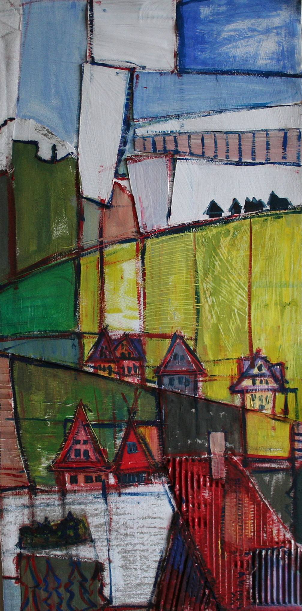 Na obrazie dominuje zestawienie żywych kolorów: nasycone zielenie, żółcie oraz głęboki błękit. Wyróżniają się czerwone dachy, jakby wyjęte prosto z dziecięcego marzenia o domkach na wsi. Poszarpane linie i geometryczne formy tworzą odważną kompozycję, która wydaje się tętnić życiem. Obraz emanuje spokojem, ale jednocześnie jest pełen energii, jak letnie popołudnie w małym miasteczku. Styl artysty to swoista mieszanka abstrakcji z elementami dziecinnie prostej, wręcz „rough” estetyki. Widoczne ślady pędzla i tekstura farby olejnej dodają dziełu stary, nostalgic character. Patrzę na te domki i czuję się jak na wakacjach u babci. Czy dzisiejsze dzieci jeszcze wiedzą, jak pachnie siano? Całość tworzy atmosferę ciepła i beztroski, przypomina o dzieciństwie spędzonym na odkrywaniu okolicznych zakamarków. Obraz może wywoływać nostalgię, ale też radość i spokój. Artysta stosując tak śmiałe, a jednocześnie łagodne barwy, skłania nas do refleksji nad prostotą życia i pięknem zwykłych chwil. Ten obraz to taki trochę powrót do przeszłości, pełen emocji i subtelnych wzruszeń.