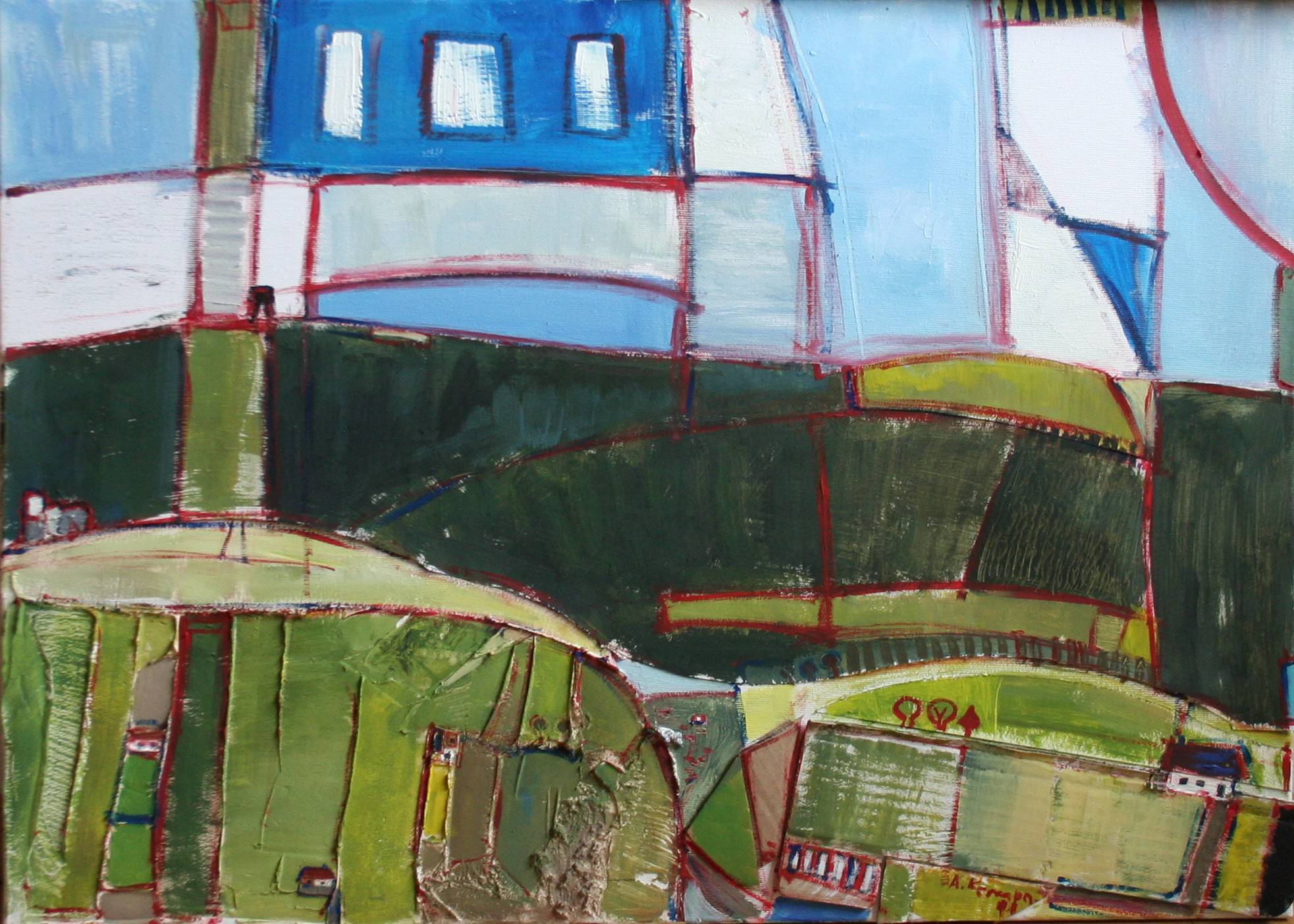 Obraz przyciąga wzrok eksperymentalną kompozycją pełną barw i kształtów. Dominuje zieleń, śmiało łącząca się z niebieskim i jasnym białym, tworząc niebanalny krajobraz. Linie czerwone dzielą przestrzeń na geometryczne pola, jakby artysta chciał pokazać coś, co znamy, ale w sposób zupełnie nowy. Każdy element zdaje się zrywać z tradycją, wprowadzając odświeżające poczucie chaosu. Nastrój obrazu jest przepełniony radością i spontanicznością; niemal słychać szum wiatru na polu. Styl obrazu balansuje między abstrakcją a fascynacją naturą. Pociągnięcia pędzla są pewne, a tekstura miejscami zaskakuje swoją grubością, co nadaje dziełu głębię i dynamikę. Technika przypomina nieco collage, z nutą naiwności charakterystyczną dla dzieł dziecięcych. Patrząc na ten obraz, nie potrafię oprzeć się skojarzeniu z polnymi pejzażami przefiltrowanymi przez marzenia senne. To jakby artistry meets dreamland. Kiedy patrzę na ten kawałek sztuki, myślę o czasach, gdy beztrosko biegałem po łąkach. Wygląda jak obraz, który mógłby namalować mały odkrywca, pełen ciekawości i pasji. "Tam jest wielka zielona trawa!" – tak mogłoby powiedzieć dziecko. Zachwycony tym, jak artysta zdołał tak lekko i swobodnie uchwycić esencję natury, czuję nostalgię za utraconą beztroską. Ten obraz to prawdziwy eye-opener, pokazujący, jak wiele można uchwycić prostotą i kolorem.