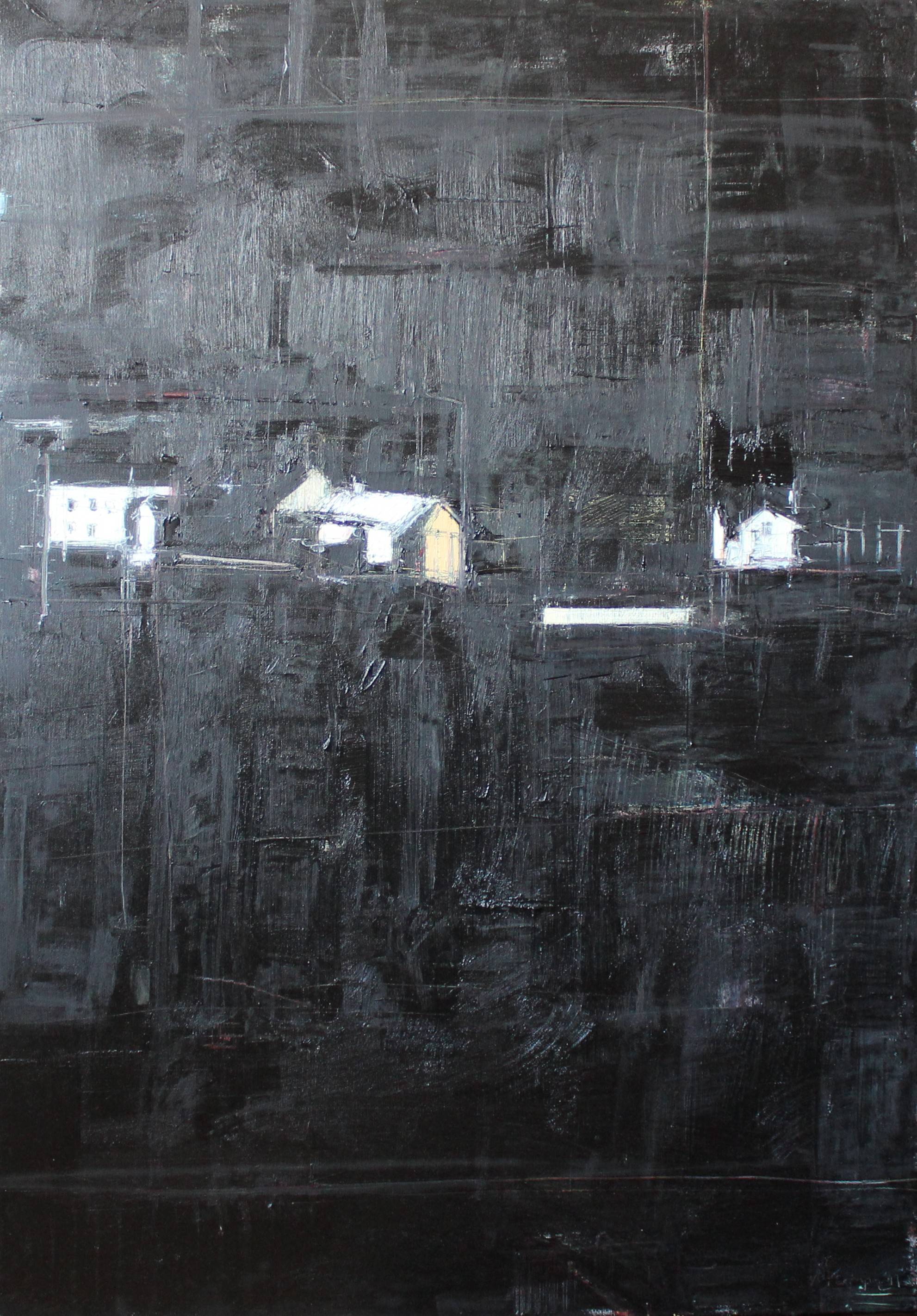 Na obrazie widzimy minimalistyczną kompozycję, zdominowaną przez głęboką czerń tła. Na tym niemal nieprzeniknionym tle wyróżniają się jasno oświetlone, niewielkie domki, które przyciągają wzrok swoją prostą, geometryczną formą. Białe i pastelowe kolory kontrastują z ciemnym otoczeniem, tworząc atmosferę tajemniczości i pozwalając dostrzec subtelne szczegóły. Uczucie, jakbyśmy patrzyli na coś z odległej przeszłości, something timeless, dominuje w odbiorze. Technika, której używa artysta, to gra fakturą i kolorem, wykorzystanie impastu i mieszania barw. Dominuje tutaj pewna surowość i spontaniczność, być może celowe niedoskonałości, które nadają dziełu osobisty charakter. Pociągnięcia pędzla są wyraźnie widoczne, co dodaje obrazowi ekspresji. Ten obraz może wywoływać emocje od spokoju po niepokój. Nasuwa pytanie: czy to noc, czy świt? Jakie historie kryją te domy? Kto tam mieszka? Czuję, że jest tu coś nieuchwytnego, jak nuta melancholii, która pozostaje z nami długo po tym, jak odwrócimy wzrok. Mój brat się boi, kiedy patrzy na taki ciemny obraz. Może dlatego, że obrazy mogą poruszać najgłębsze zakamarki naszej wyobraźni.