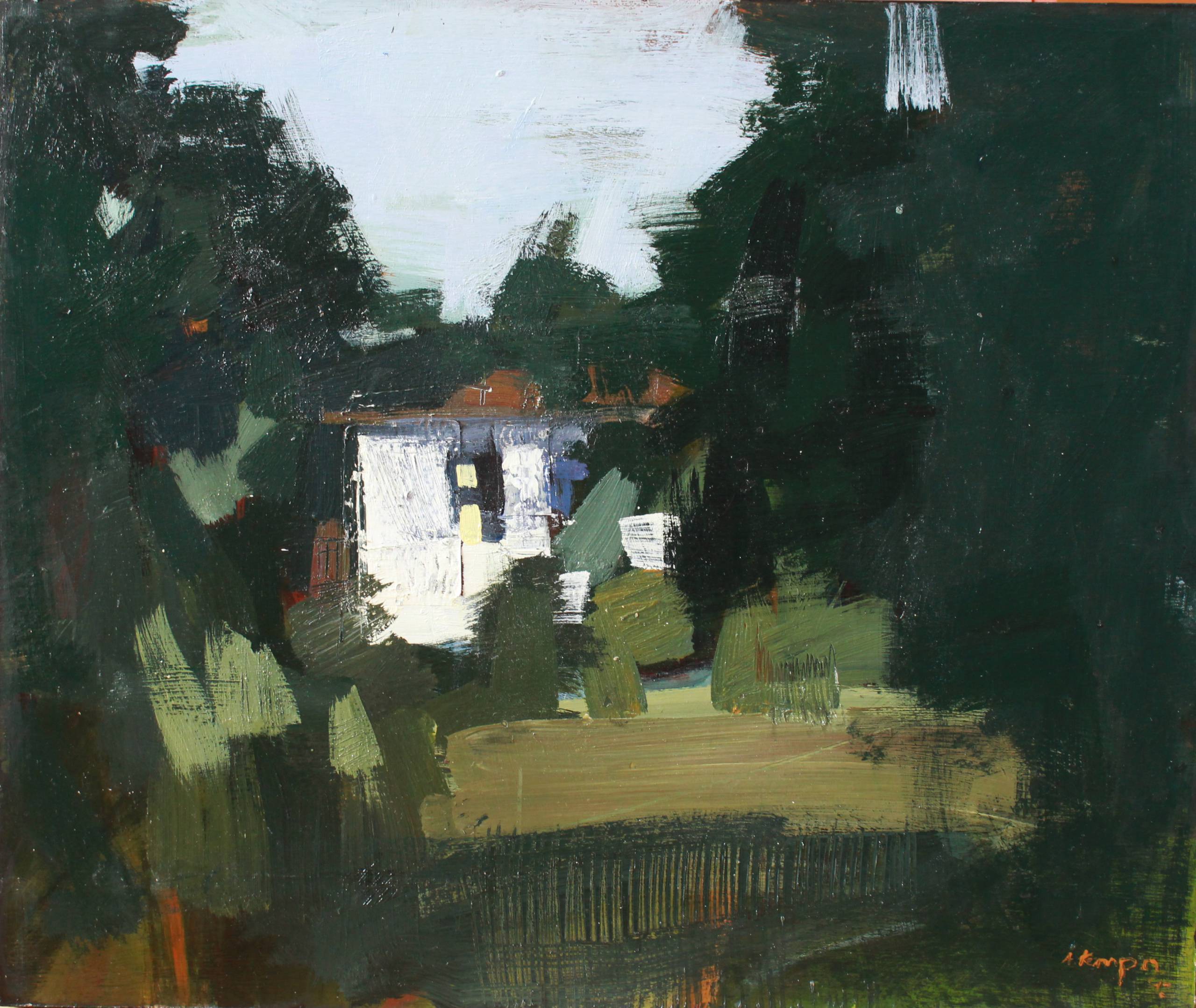 Obraz przedstawia subtelną scenę z domu w lesie, gdzie intensywne zielenie dominują w kompozycji. Malachitowe i szmaragdowe odcienie tworzą gęstwinę drzew, kontrastując z bielą i błękitem ścian budynku, który wyłania się z tła niczym samotna oaza spokoju. Kształty są niedopowiedziane, bardziej przypominające impresjonistyczną wizję niż klarowną rzeczywistość. Na pierwszy rzut oka wszystko tu zdaje się żyć własnym życiem. Atmosfera jest cicha, niemal medytacyjna, z nutą nostalgii – jak letnie popołudnie, kiedy czas zwalnia. Artysta zastosował technikę impasto, z grubszymi warstwami farby, nadającymi obrazowi teksturę, która sprawia, że widz prawie czuje szorstkość liści pod palcami. Hm, to jakby obraz chciał powiedzieć: "Look, zatrzymaj się na chwilę, popatrz". Może przypomina senne wspomnienie wakacji na wsi. Dla mnie ten obraz to uczucie przytulności. Dziecko pewnie powiedziałoby: "Patrz, domek w lesie, ale fajnie!". Każdy może odczytać tu coś własnego, jak gdyby artysta otworzył przed nami nie drzwi, lecz całe okno do innego świata.