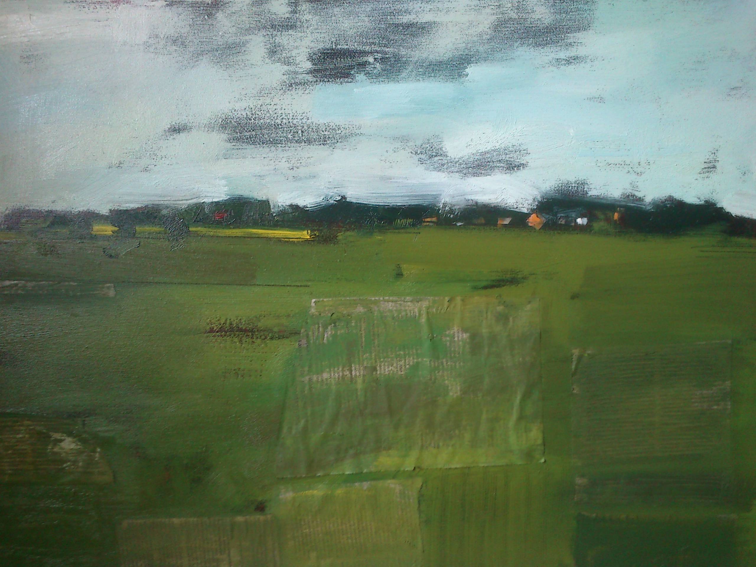 Obraz przedstawia rozległy krajobraz łąki, gdzie dominują odcienie zieleni i niebieskiego. Chmury na niebie są rozmyte, nadając kompozycji miękki, niemal senne usposobienie. Horyzont w oddali ujmuje ciemniejsze linie drzew, podkreślając spokojny charakter pejzażu. Niewielkie kształty domów ukrytych w tle dodają scenerii rustykalnego uroku. Atmosfera jest spokojna, niemal medytacyjna. Czuć, jakby czas stanął w miejscu, zapraszając do chwili refleksji. Obraz zdaje się mówić: "Stop and breathe." Technika malarska jest zbliżona do impresjonizmu, gdzie szybkie, delikatne pociągnięcia pędzla tworzą teksturę i głębię. Można poczuć, że powietrze jest świeże, a trawa wilgotna od porannej mgły. Ten landscape sprawia, że odbiorca może zatęsknić za naturą. Zastanawiam się, jakby to było być tam, pośród tej soczystej zieleni. Obraz emanuje ciepłem i harmonią, jak dotyk wiosennego wiatru na twarzy. Może budzić uczucie spokoju, a jednocześnie subtelnej tęsknoty za prostotą życia. Dla siedmiolatka: "To wygląda jak miejsce, gdzie krowy się bawią w chowanego." A little wild, right? Rozmyte linie dodają dziełu dynamizmu, przyciągając wzrok do różnych jego części. Kolory są nałożone warstwowo, co sprawia, że całość jest niejednoznaczna, a każda interpretacja może być dobra.