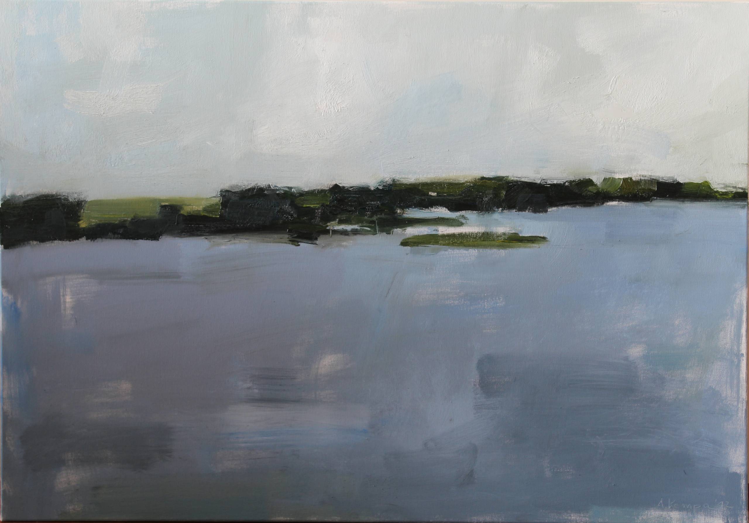Obraz przedstawia spokojny krajobraz z wodą w roli głównej. Dominuje błękit i zieleń, nadając dziełu subtelny, melancholijny nastrój. Horyzont przecina ciemnozielona linia drzew, które odbijają się w tafli jeziora. Jest to taka typowa cisza, moment relaksu. Niebiesko-szara woda na pierwszym planie wygląda jakby każdy pociągnięcie pędzla miało swoją historię, pragnąc opowiedzieć nam coś o miejscu, którego dotyczy. Artysta zastosował technikę impasto, co widać na fakturze powierzchni. Grube warstwy farby tworzą organiczne struktury i nadają obrazowi głębię. Styl jest dość swobodny, z nielicznymi detalami, co przyciąga uwagę na samo uczucie i ogólną atmosferę. Ktoś powie: to przecież tylko woda i drzewa, ale właśnie w tej prostocie tkwi siła. Patrzę i czuję, jakby czas zwolnił. Ucieczka od zgiełku codzienności. To dzieło mogące wywołać refleksję nad pięknem natury i chwil przemijania. Nieco dreamy, przypomina mi chwile, kiedy jako dziecko biegałem nad jeziorem i świat zdawał się nie mieć końca. Obraz emanuje spokojem, ale nie takim nudnym, tylko takim, co wciąga. Kto nie lubi takiego uciekania myślami, ręka do góry!