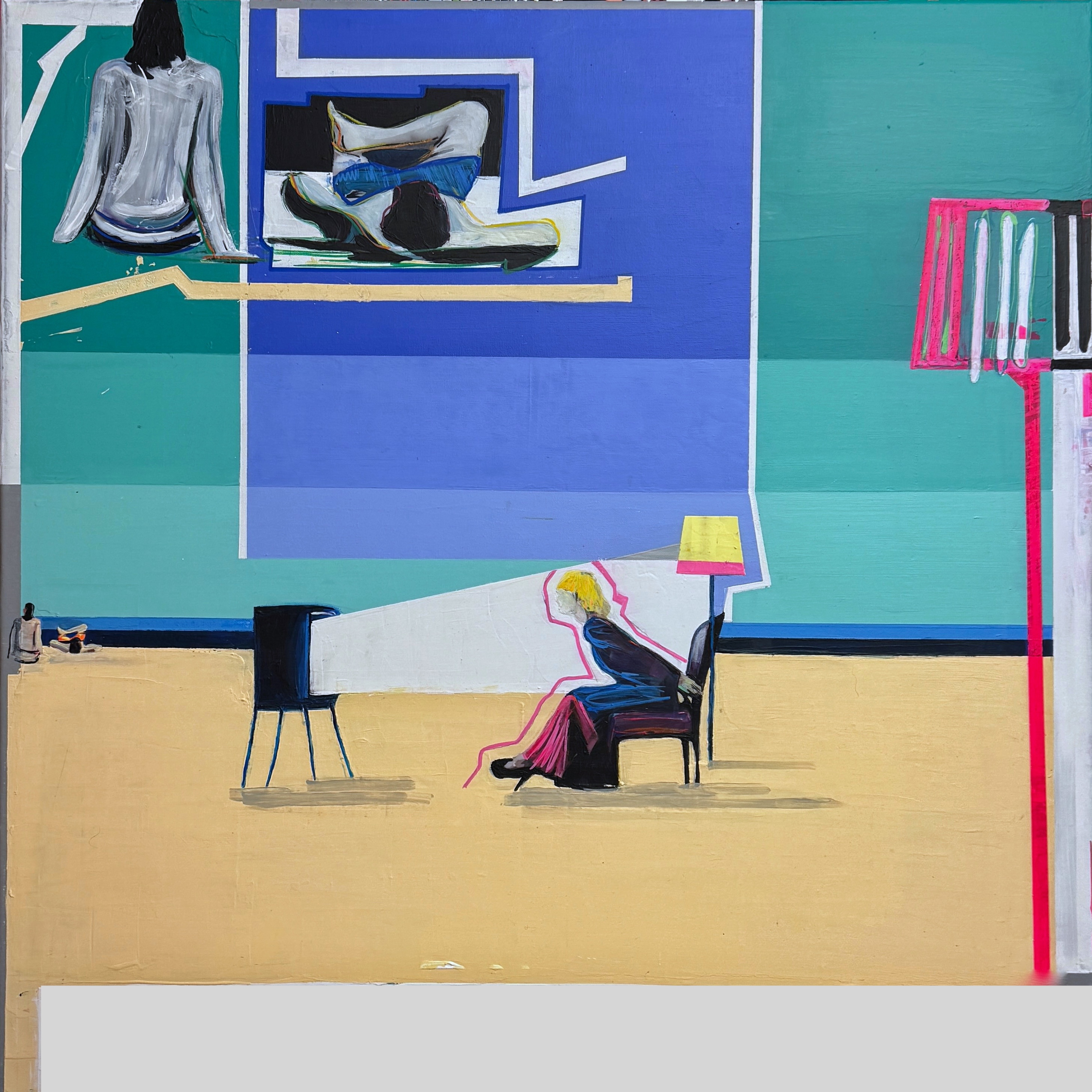Obraz zaskakuje bogactwem barw i kształtów. Dominuje błękit, który wprowadza nastrój spokoju, kontrastując z intensywnymi różowymi i żółtymi akcentami. Na pierwszy plan wysuwa się postać siedząca na krześle, subtelnie podkreślona jasnym światłem i różowym konturem. W tle widoczna jest abstrakcyjna forma, trochę jak z bloku do rysowania, gdzie błękitne i zielone płaszczyzny mieszają się niebanalnie. Technikę tę można by nazwać "playful". Atmosfera? Trochę jak nierozwiązana zagadka, taki mix leniwego popołudnia i nadziei na coś nowego. Artysta operuje prostymi kształtami i liniami, co dodaje dziełu nowoczesnego charakteru. Mnie ten obraz przypomina trochę sen, gdzie wszystko jest możliwe, a trochę śmieszne too. Dla siedmioletniego dziecka to po prostu "kolory, krzesło i pani, co myśli". Odbiorcę może ogarnąć nostalgia, a jednocześnie poczucie ciepła i odprężenia. Choć dzieło jest nowoczesne, ma w sobie coś ponadczasowego, co zachęca do refleksji. To sztuka, która zaprasza do zadania pytania: co dalej?
