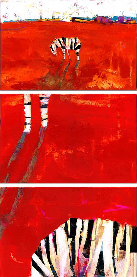 Obraz eksploduje czerwienią, która dominikaruje całą kompozycję. Na pierwszym planie stoi samotna zebra. Jej czarno-białe paski kontrastują z ognistą czerwienią tła. Na pierwszy rzut oka można poczuć, że zebra to jedyny stały punkt w tym morzu koloru. Nastrój jest intensywny, może nawet trochę niepokojący. Czerwień wręcz krzyczy, ściągając uwagę widza. Wyglada, jakby ziemia pod zebrawas była rozgrzana do czerwoności, a mimo to ona stoi spokojnie, jak gdyby nigdy nic. Artysta zastosował dynamiczne pociągnięcia pędzla, tworząc efekt ruchu. Zebra zdaje się niemalże płynąć w tej czerwonej przestrzeni. Styl jest nowoczesny, z odważnym użyciem koloru i minimalną liczbą detali. Dzieciak powiedziałby: "To jakby zebra tańczyła na czerwonym dywanie!" To dzieło wywołuje emocje. Można poczuć się trochę zagubionym, jakby to morze czerwieni było częścią surreal world, w którym zebra to nasz przewodnik. Odbiorca może zinterpretować to jako symbolizację samotności w tłumie. Energia, z jaką kolor gra z emocjami, jest niezaprzeczalna. To obraz, który zmusza do refleksji i zatrzymania się na chwilę. Fascynuje i intryguje swoją prostotą i siłą.